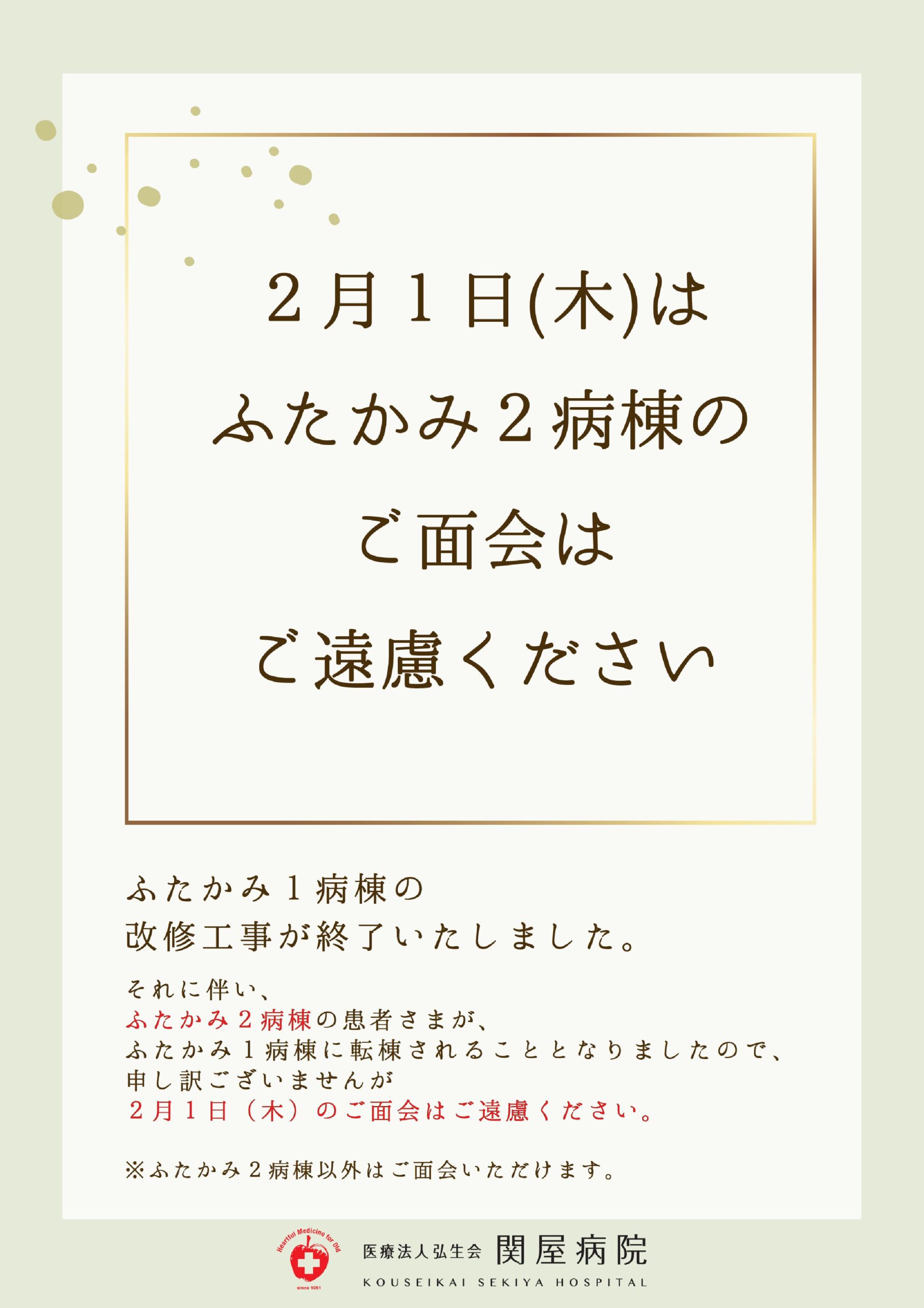 お知らせ新着情報【重要】転棟のため、2月1日(木)はふたかみ2病棟の面会を中...
