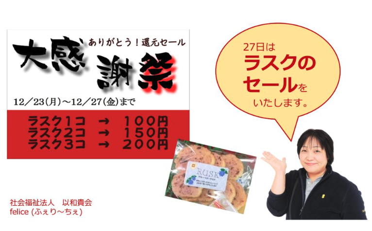 お知らせ12月27日パン販売は「ラスク」がお得です。