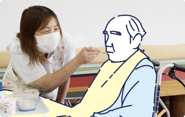 食事中は、開口や嚥下の状態、食の進み具合から体調をうかがい知ることができ、食後の口腔ケアの際は口元や口の中を見ることができるので、歯肉炎や口内炎、歯の欠けや抜けなど、口の中の変化にも気づくことができます。スタッフは目線の高さを合わせて食事介助をします。同じ高さなら患者さまの飲み込み具合が非常によくわかるからです。また、健側(けんそく)から介助することで、麻痺側に残渣(ざんさ)を確認することができます。