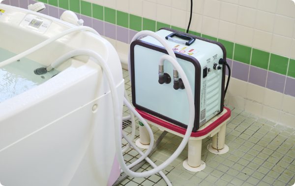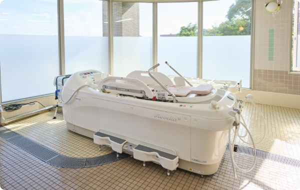 当院では、つかまり立ちができ座位の保持が可能な患者さまには車椅子に乗った状態で入浴できる機械浴を、離床が難しい患者さまにはストレッチャーで横になったまま入浴できる機械浴を行っています。