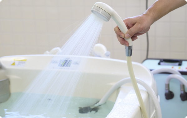 入浴は、皮膚の状態を観察する上でもとても大事な機会といえます。また、当院では、身体機能の衰えを防ぐ意味で患者さまがご自身でできることはご自身でしていただいているので、入浴は患者さまのADL(Activities of Daily Living:日常生活動作)の状態を確認する機会にもなっています。