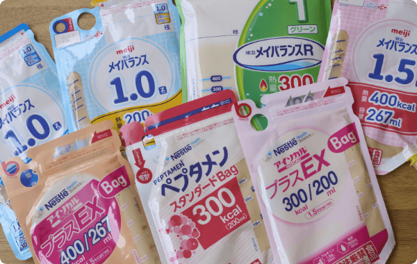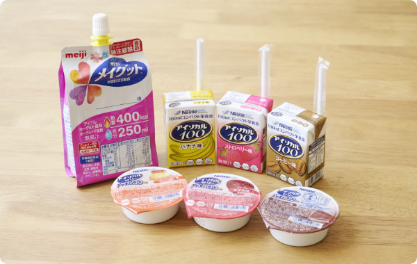 食事が食べにくくなった患者さまには、ドリンクやゼリーで栄養を摂取していただいています。口からではなく経管で栄養摂取をしていただいている患者さまにおいては、それが食事と同じ意味をもつもの。当院では、そう考えて、ご用意をしています。