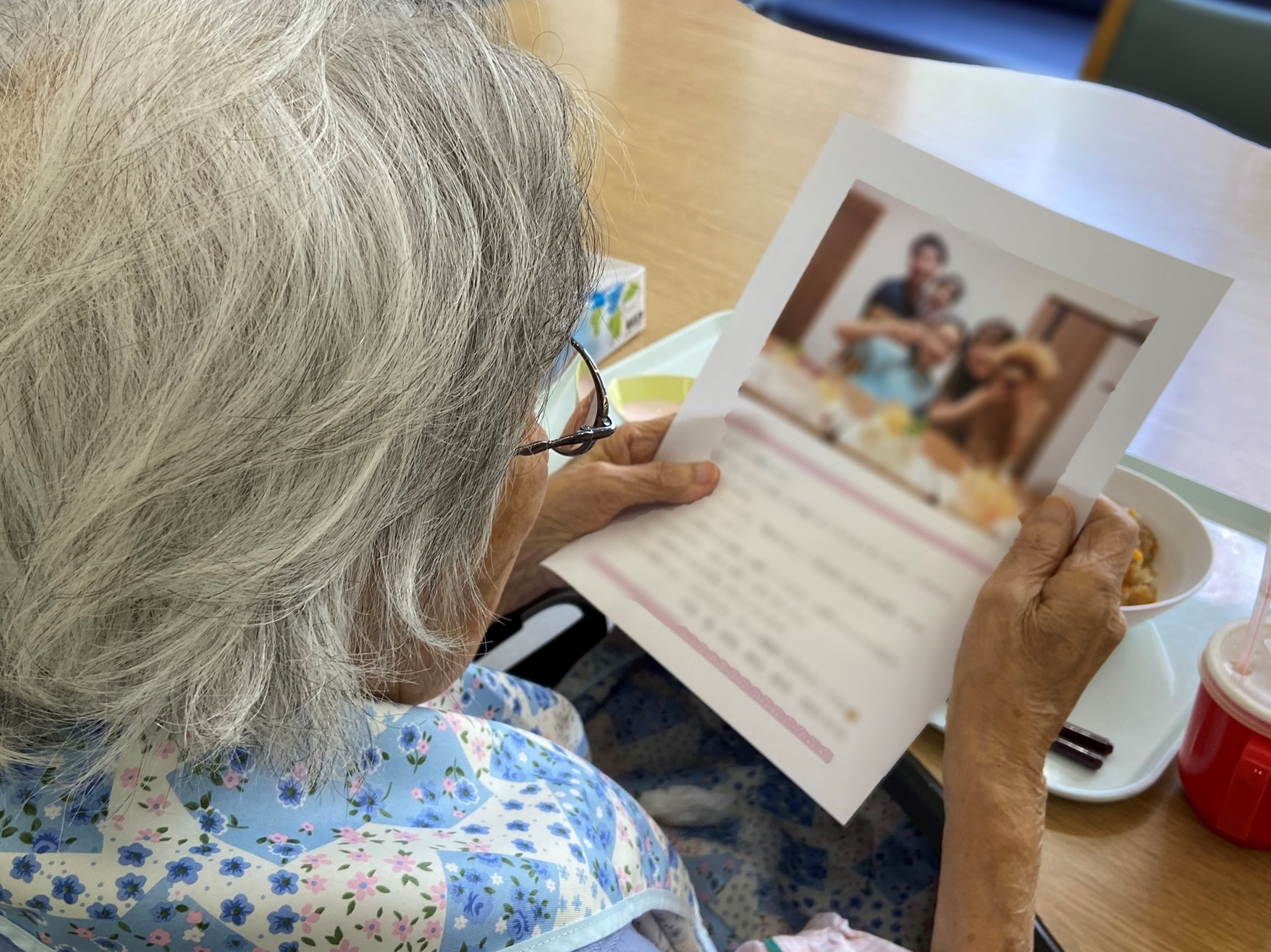 こちらの患者さまは、写真をご覧になり「孫と孫のお嫁さんが写っているわ。そうそう、こちらはね、ひ孫の…」とスタッフにご家族をご紹介。