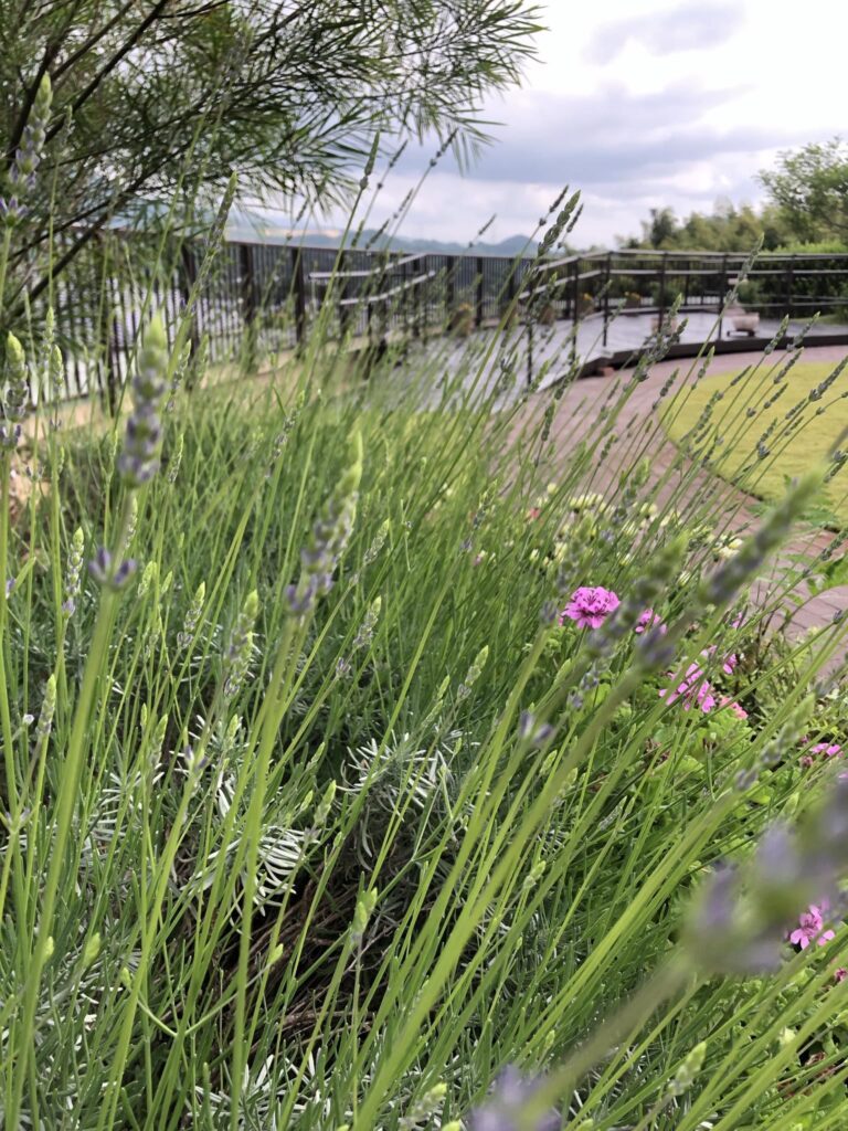 あおぞら庭園には、 ローズマリー、 ラベンダー、ゼラニウム、 レモンバーム、 レモンバーベナ、 タイム、 ラムズイヤー、 エキナセアなどのハーブを手の届きやすいところに植えています。