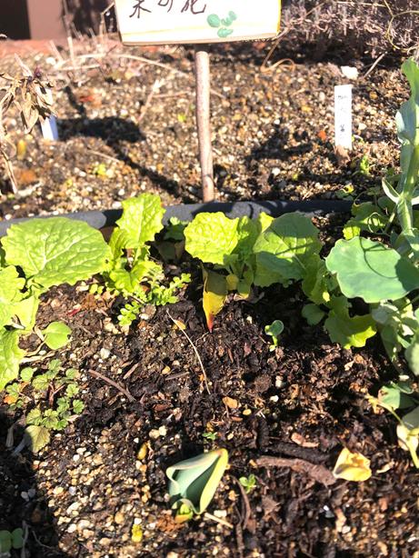 あおぞら庭園の一角には、リハビリスタッフと患者さまが一緒に育てている庭があります。チューリップの球根を植え、菜の花の種をまいており、チューリップの芽が少しずつ顔を出し始めました。
