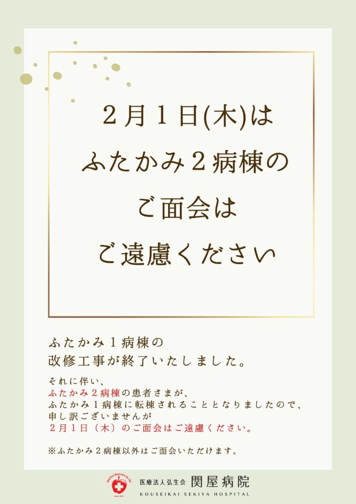 【重要】転棟のため、2月1日(木)はふたかみ2病棟の面会を中止いたします 2024.01.31 お知らせ新着情報 ふたかみ1病棟の改修工事が終了いたしました。 ふたかみ2病棟の患者さまが、ふたかみ1病棟に転棟されることとなりましたので、申し訳ありませんが、2月1日(木)のご面会はご遠慮ください。なお、ふたかみ2病棟以外のご面会は通常通り行っております。
