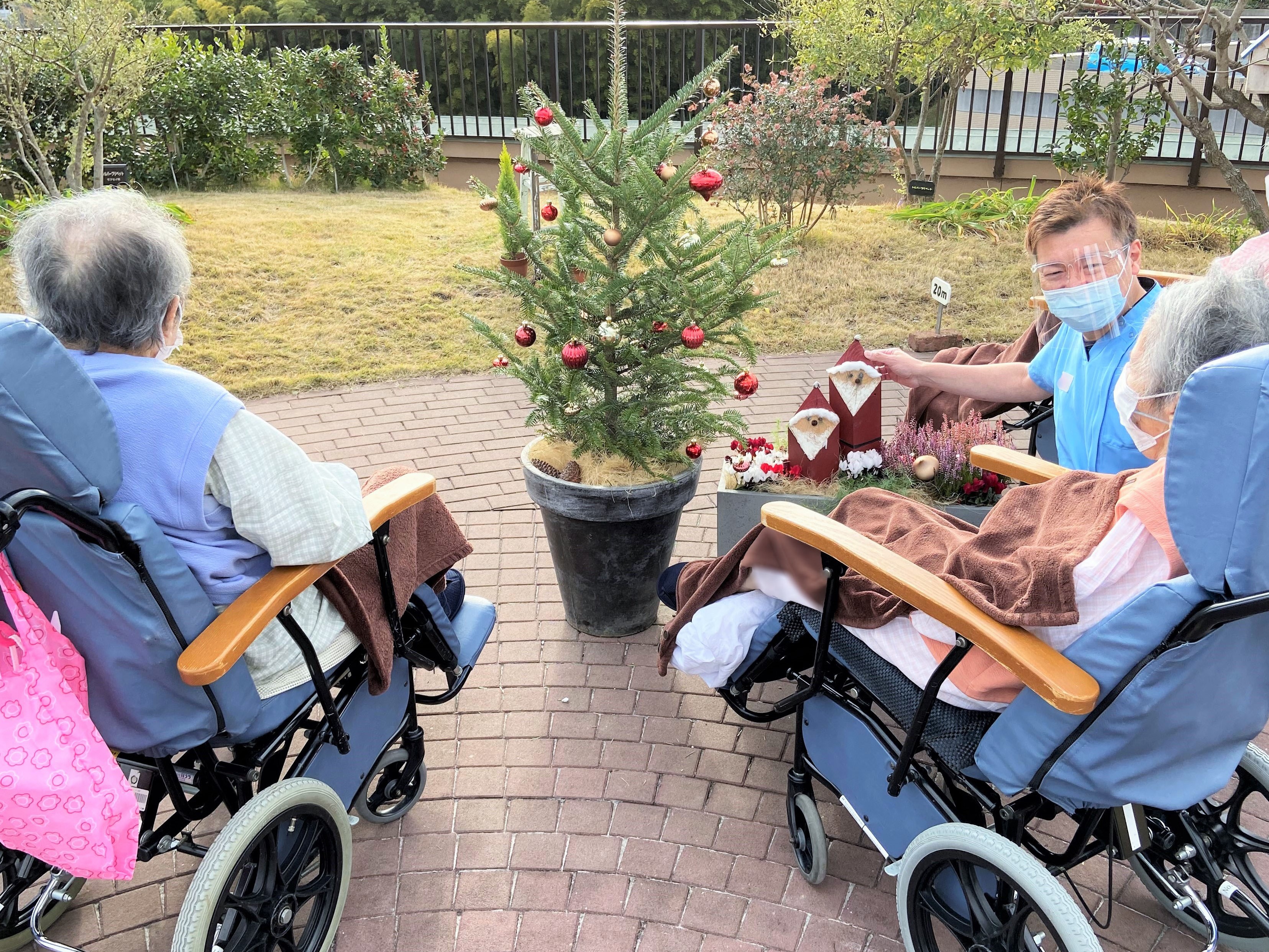 あおぞら庭園がクリスマスの装いになりました 2022.12.16 お知らせ 四季を感じていただこうあおぞら庭園のディスプレイは、季節ごとに変えています。 12月はクリスマスツリーとサンタ グリーンホスピタルプロジェクトのスタッフ手作りの木製サンタです。 クリスマスカラーの紅白のシクラメンも。 オーナメントも飾りつけました。 エレベーターホールでは小さなサンタが患者さまをお出迎え。 患者さまはクリスマスの思い出話をしながらご覧になっていました。