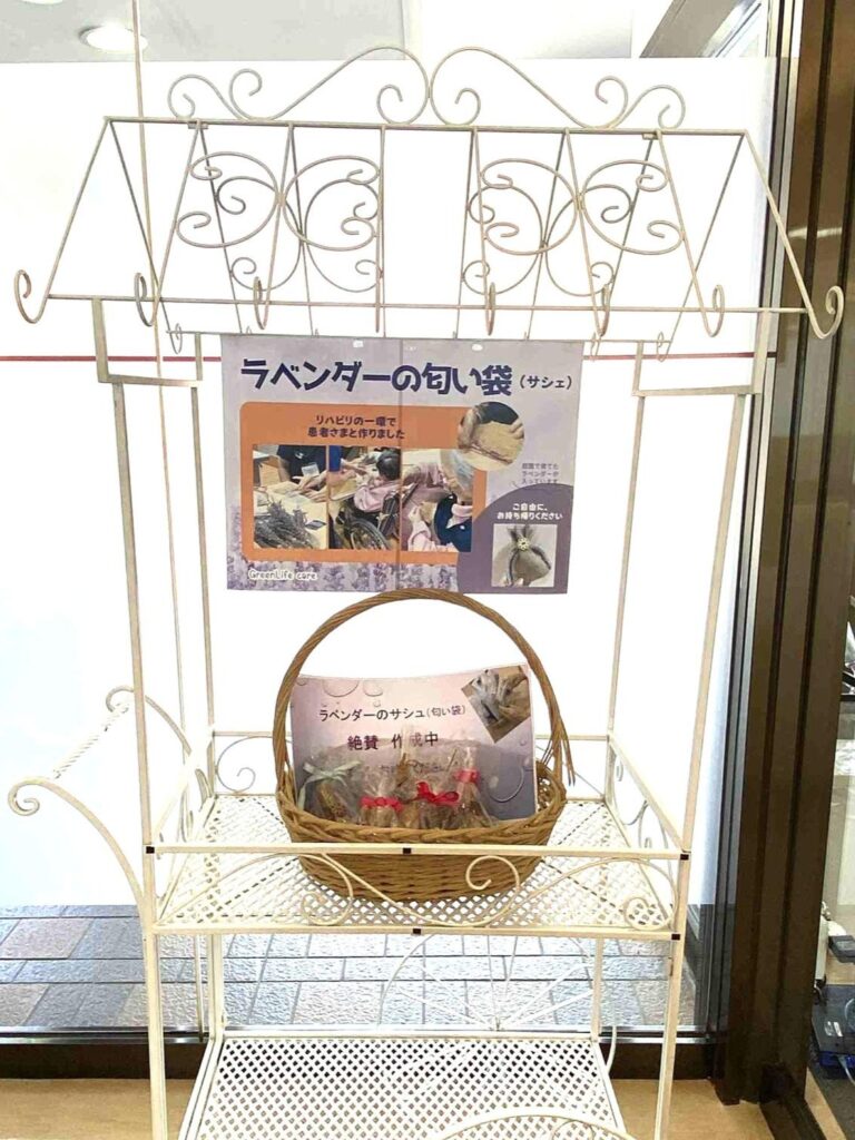完成したサシェは、ご自室に置いていただいたほか、正面玄関の白いワゴンにも一部をならべ、ご来院の方にもお持ち帰りいただきました。