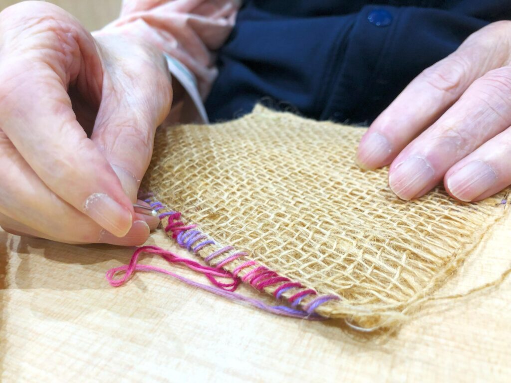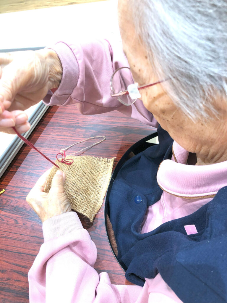 針を通す、布を折る、ひもを通して結ぶ──。それぞれの工程は指先や手首を動かすことになり、楽しみながら無理なく取り組める機能訓練のひとつとして、リハビリにもつながります。