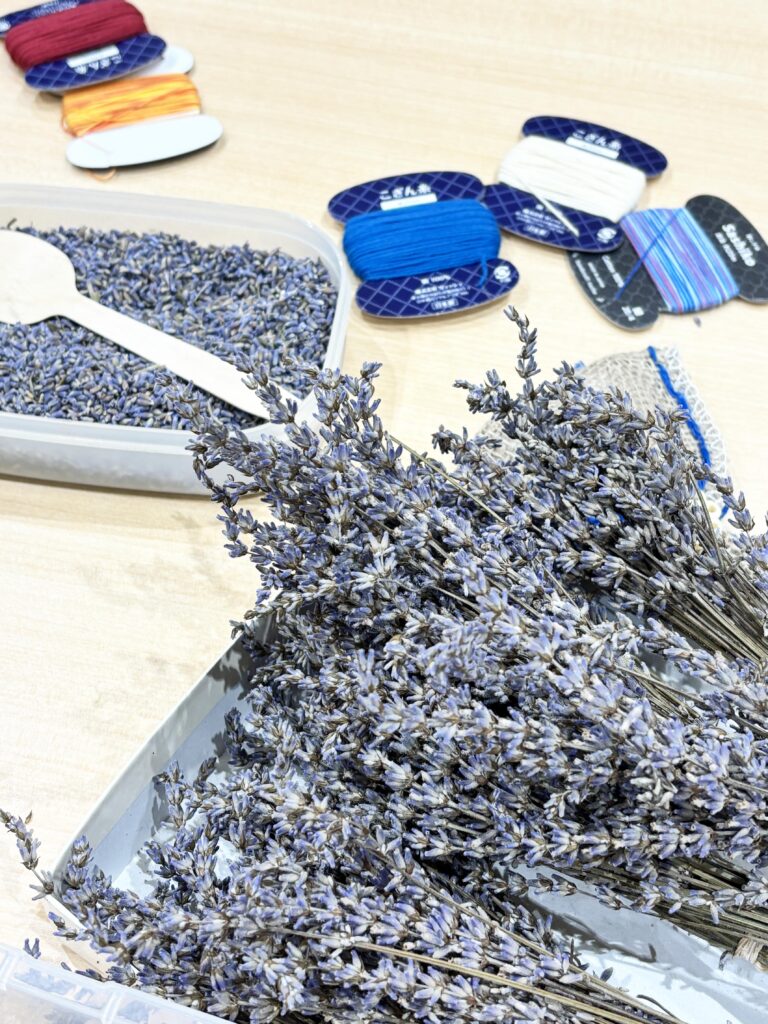 袋ができあがったら、中にラベンダーを丁寧に詰め、香りを閉じ込めるようにひもで口を結びます。完成した瞬間には、ふんわりとラベンダーの香りが広がり、どこか懐かしく、やさしい気持ちになるようなひとときとなりました。