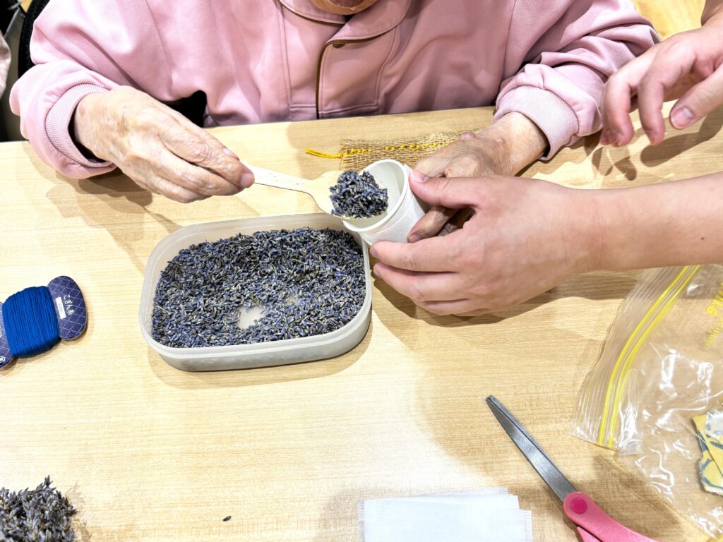 あおぞら庭園で春から大切に育ててきたラベンダーを使い、患者さまと一緒に行った「香り袋(サシェ)」づくり。