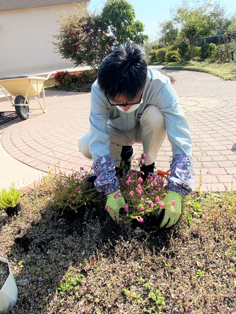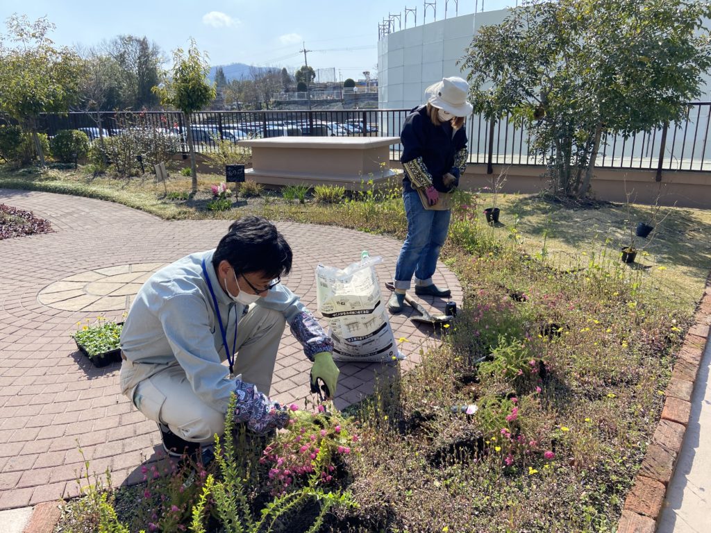 春の花が咲き始めた先週、前回に引きつづきグリーンホスピタルプロジェクトであおぞら庭園に花を植えました。