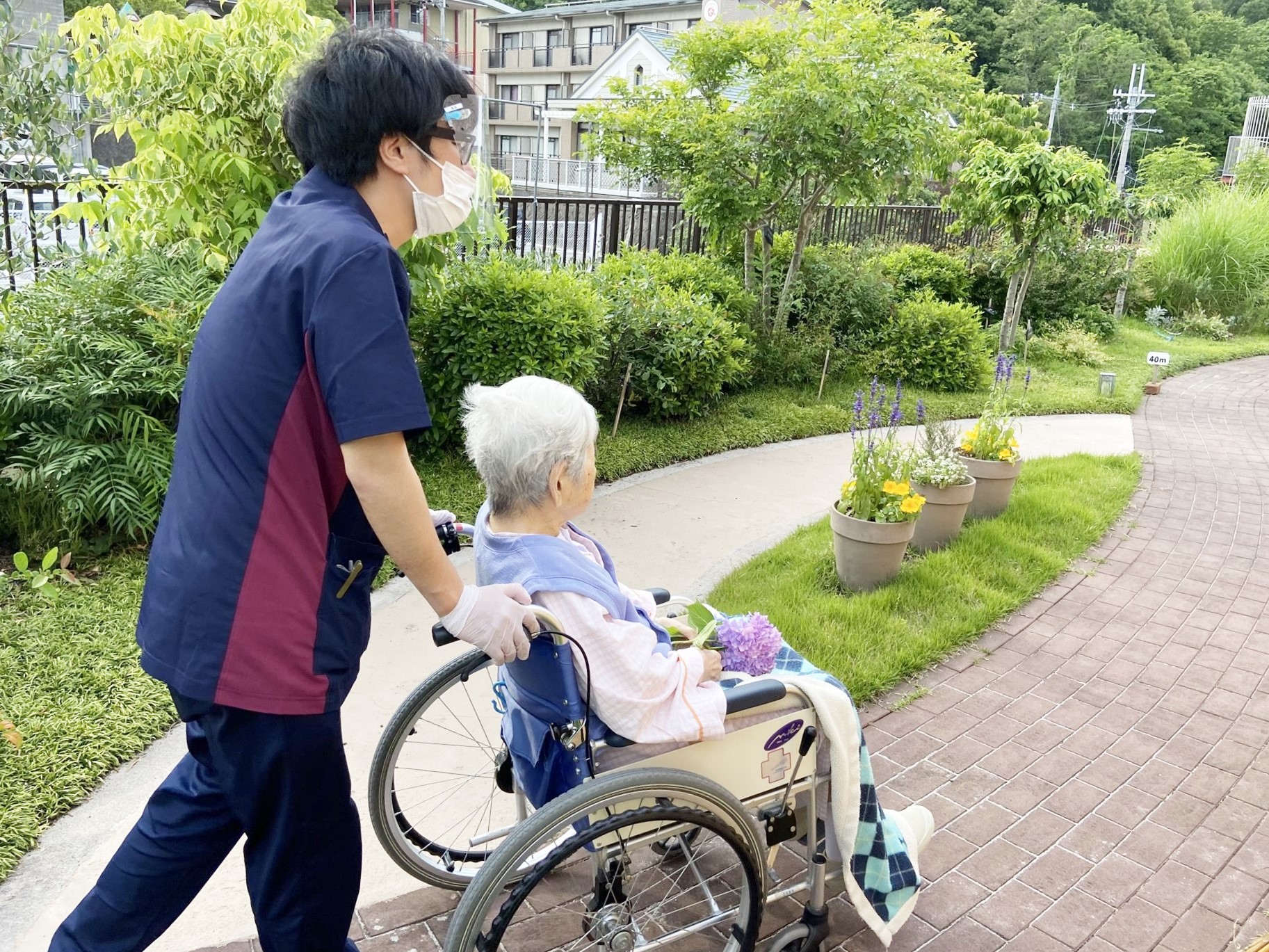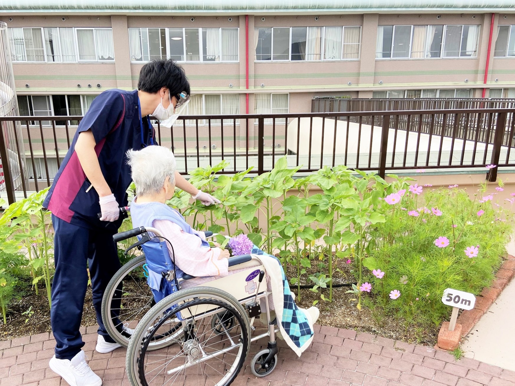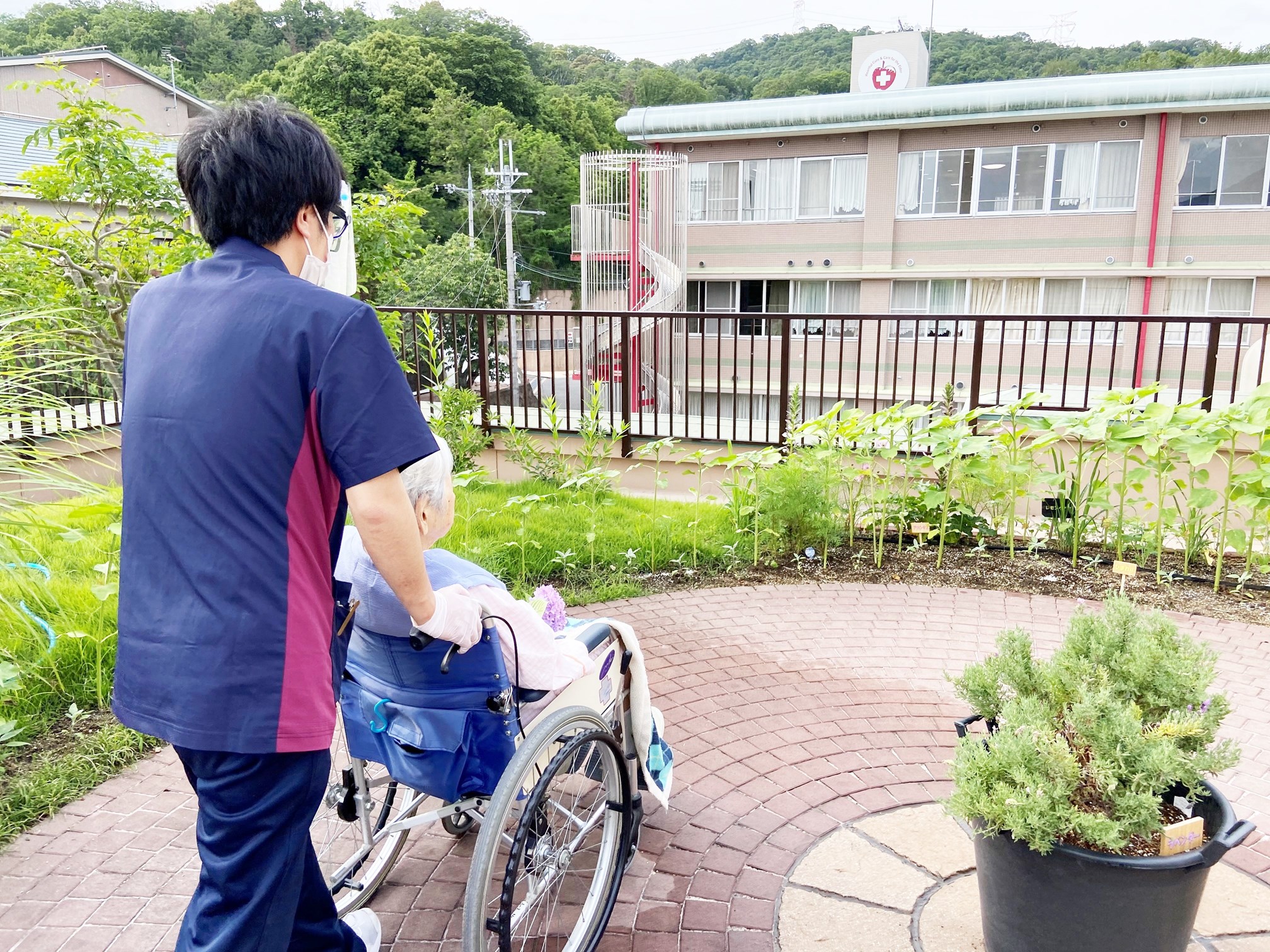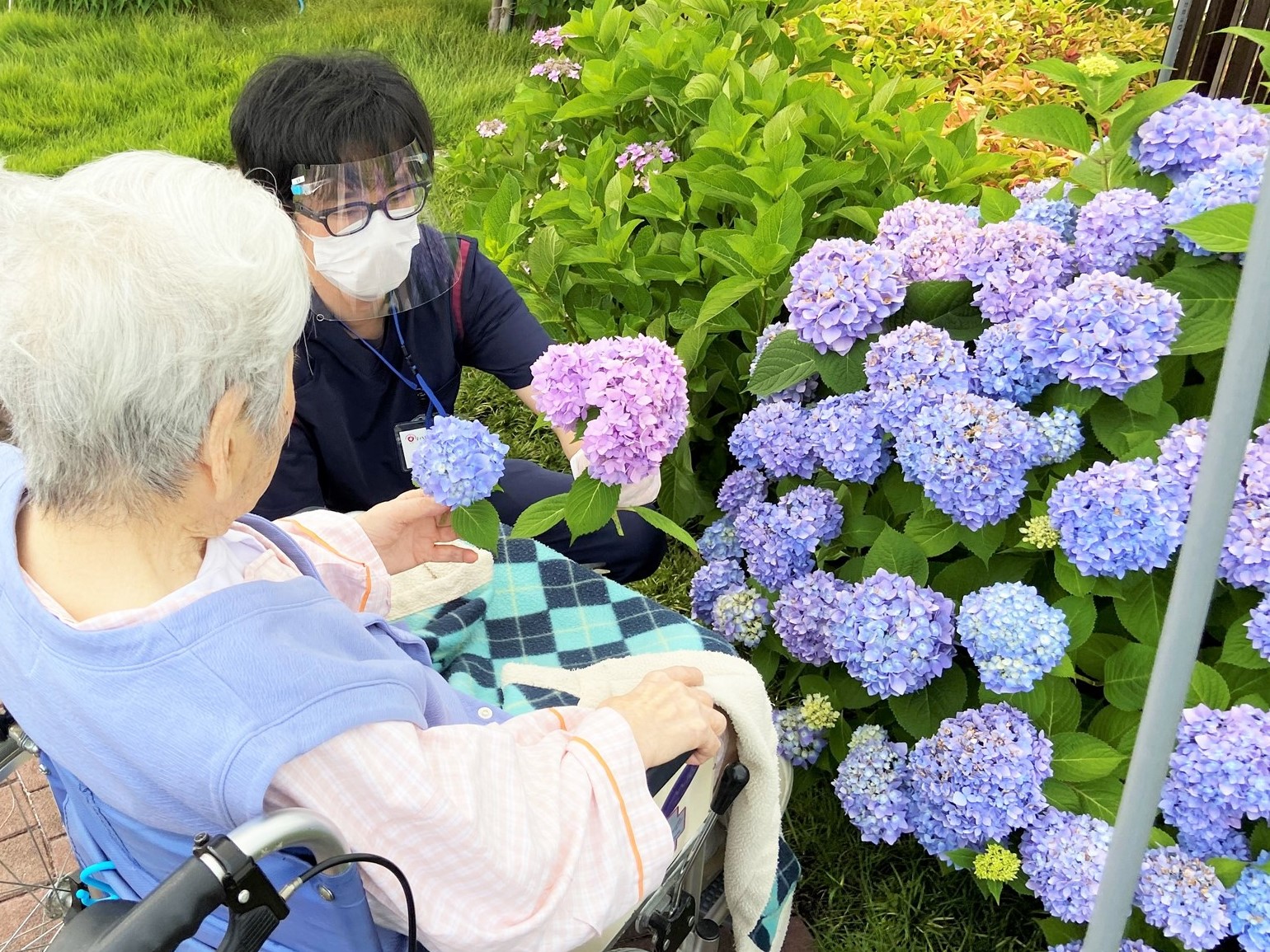 あじさい散歩 (あおぞら庭園にて) 2021.06.21 お知らせ 当院のあおぞら庭園には、あじさいが薄藤色や菖蒲色など色鮮やかに咲いています。 患者さまが手にされているのは、摘んだあじさいです。 さぁ、もう一回り散歩を続けましょう。 庭園を進んでいくと、ヒマワリが見えてきました。 4月に種をまいた ひまわり70本。 種まきから2カ月。 今ではこんなに大きくなりました。