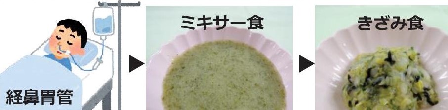 口からの食事が難しく、鼻から管を通して栄養を摂る状態(経鼻胃管)で入院されましたが、患者さまが口からのお食事を希望されたのでミキサー食の食事を始めました。