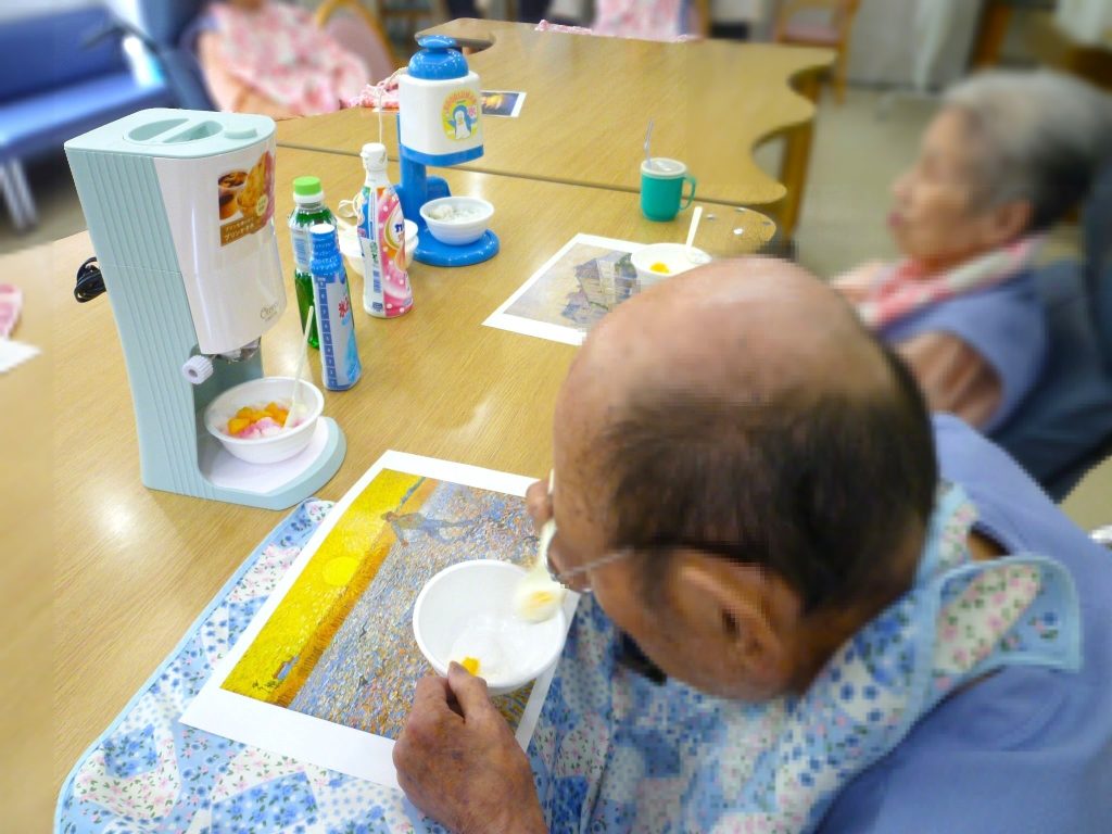 かき氷 ~ふたかみ1~ 2023.08.10 イベント くちどけがまろやかな台湾かき氷の機械を使って作りました。 なんと2杯召し上がる方もおられるほど大好評! あんこやフルーツなどのトッピングも人気でした。 どのお味にしますか?