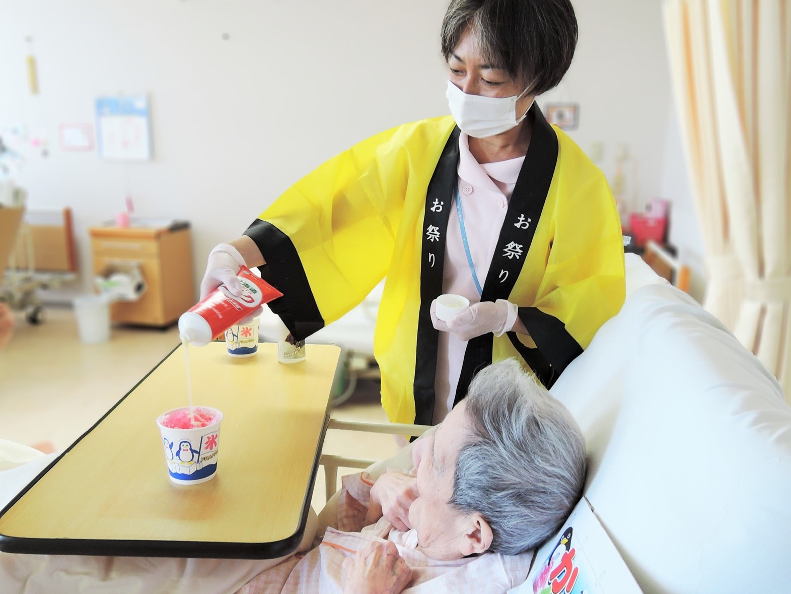 かき氷を食べて、暑い夏を乗り切ろう!~かつらぎ棟4階~ 2021.08.20 お知らせ ひんやり甘い夏のスイーツ「かき氷」のワゴンサービスの始まりです。 シロップはイチゴ、メロン、みぞれの3種類。練乳もご用意しました。 練乳もご用意しました。 「久しぶりに食べたわ」「冷たくて美味しかったよ」と大好評でした。