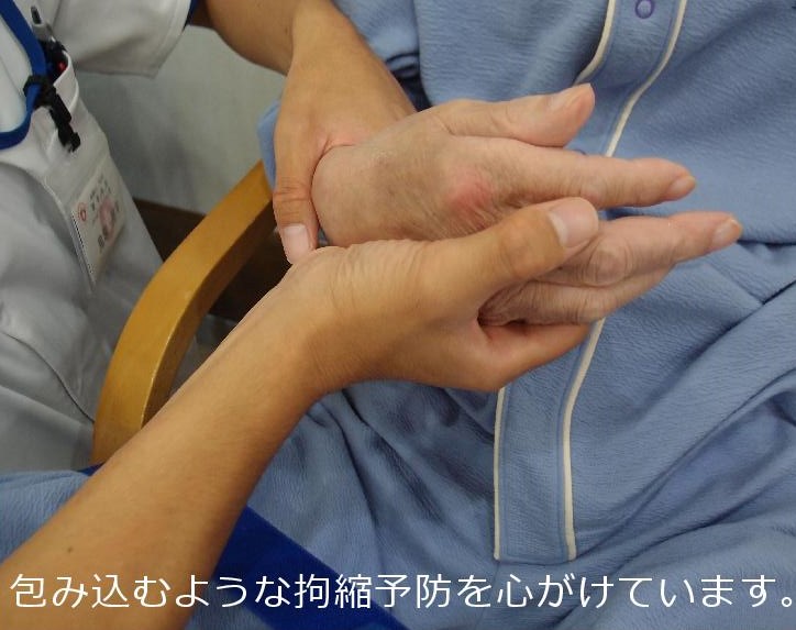 拘縮とは関節が動きにくくなった状態です。その原因は筋肉の短縮または収縮です。それを緩めるためにマッサージやストレッチなどを状態に合わせて行っています。一番必要なのは「安心感」を持っていただくことです。心の緊張は体の緊張につながるので、少しでも安心していただくために包み込むように行うことを心がけています。