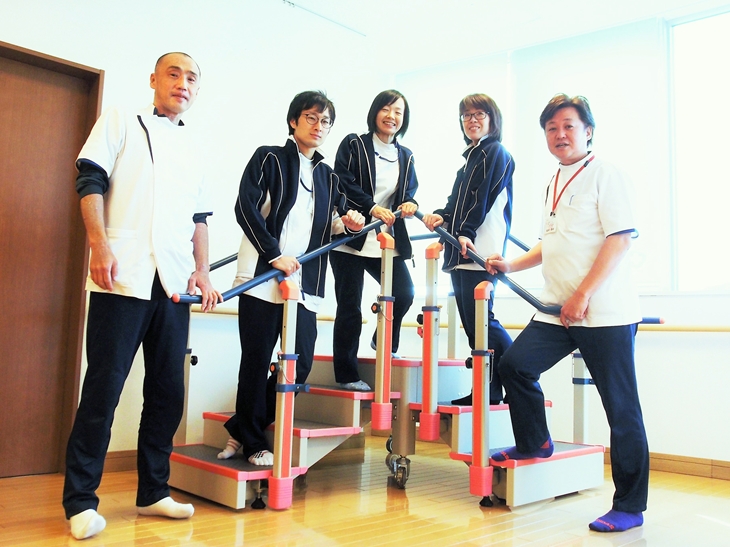 スタッフは理学療法士(PT)3名、作業療法士(OT)2名の計5名です。リハビリ内容は、自主トレーニングによる滑車運動やペダル運動、物理療法では温熱や加圧マッサージ、最新の足底振動刺激機器を使って筋力強化運動等を行っています。居室ベッドや廊下手すり、屋上や玄関エントランスなどで患者さまに応じた内容を施術しています。これからも「生活の質の向上」を目指しさまざまなリハビリの取り組みを行っていきます。