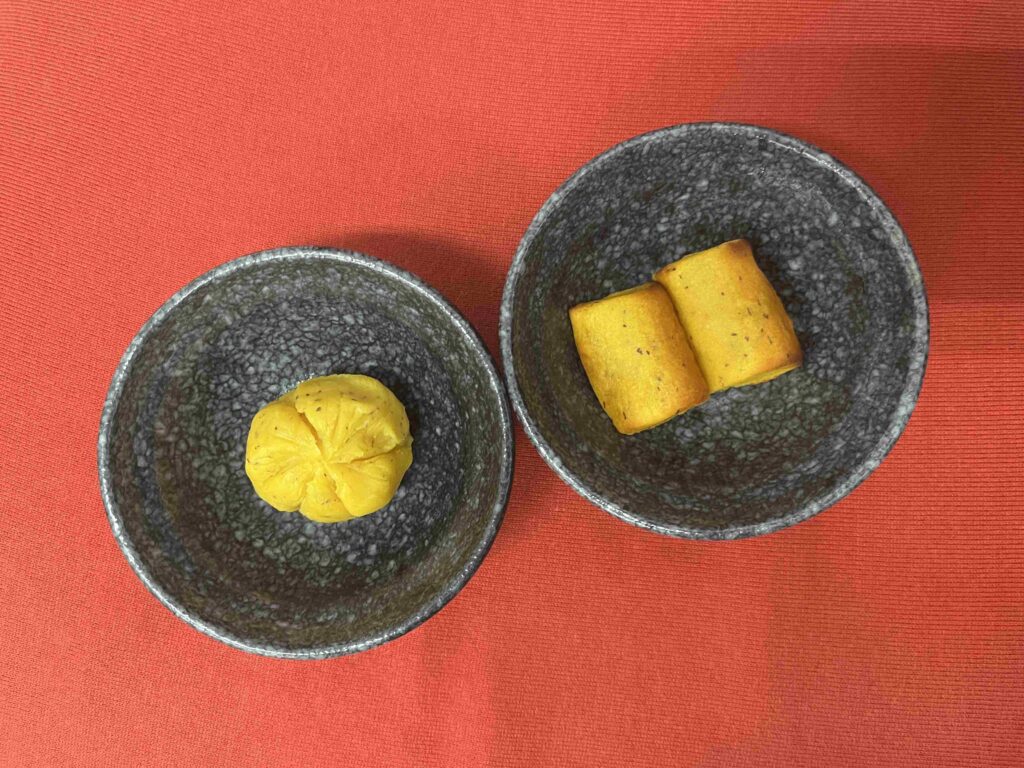 左:スイートポテトをすりつぶした茶巾絞り 右:スイートポテト