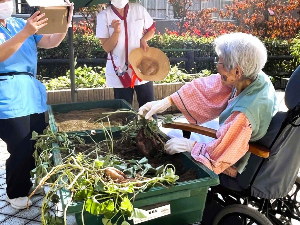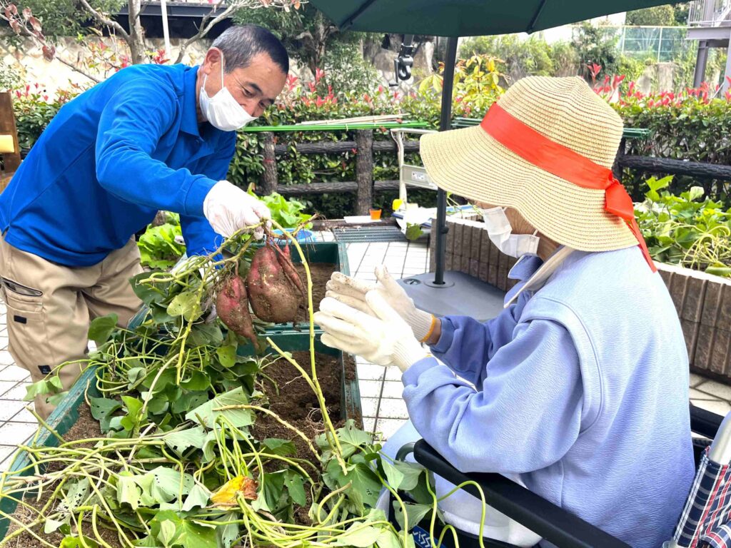 患者さまおひとりではさつま芋がなかなか掘れず、「もしかして大物かも?」と最後は施設スタッフも参戦!