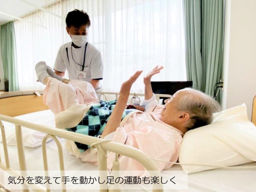 リハビリテーション室は理学療法士3名と作業療法士1名の計4名が在籍し、リハビリ室だけでなく、ベッド上や屋外などさまざまな場所で行います。