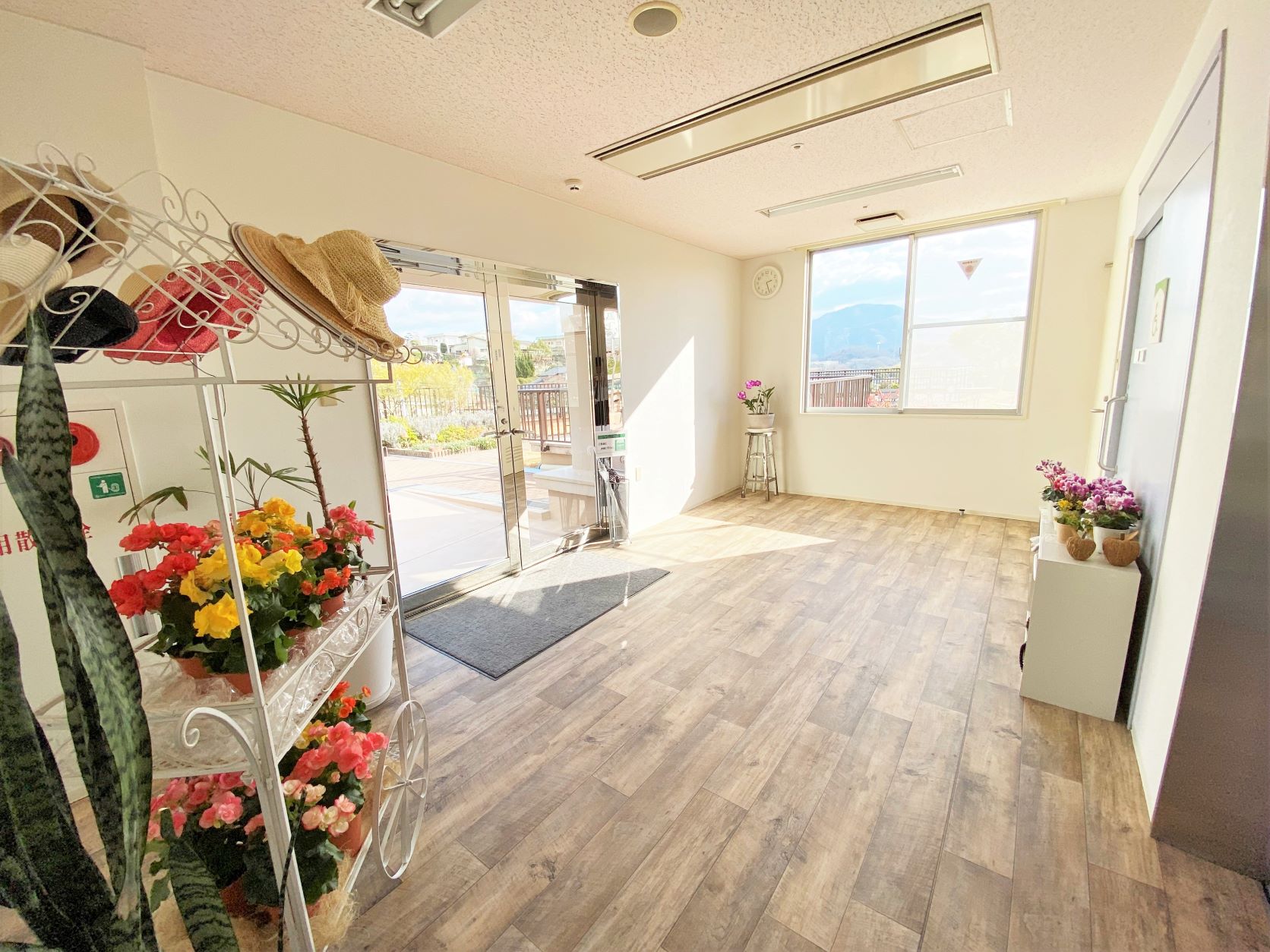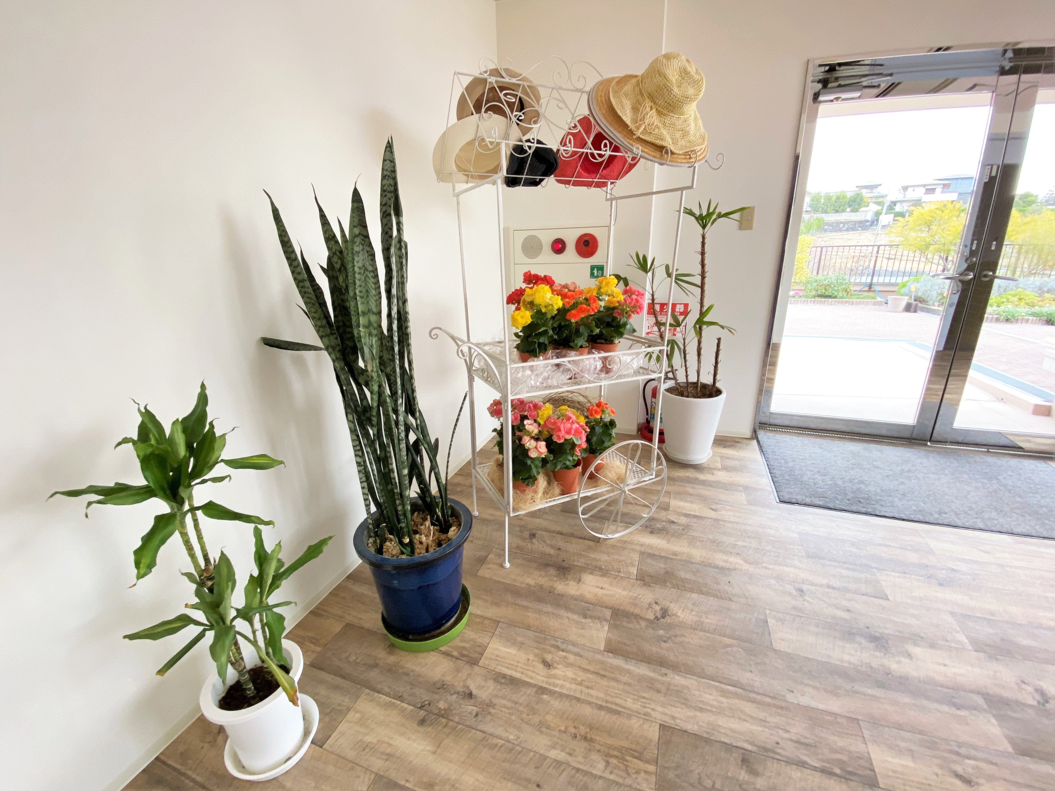 エレベーターホールには、患者さまが庭園を眺めるだけではなく、寒い日や天候の悪い日でも緑を感じていただけるようにたくさん花や緑を置いています。