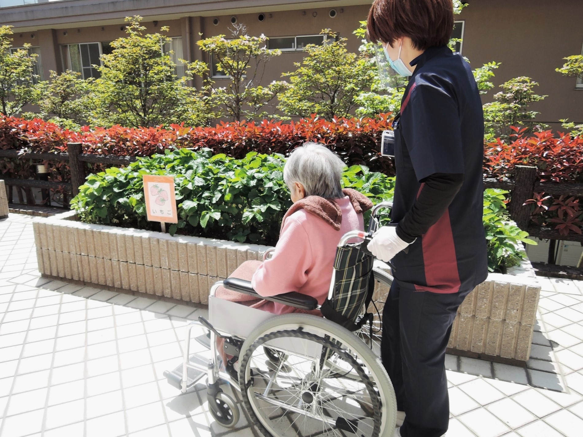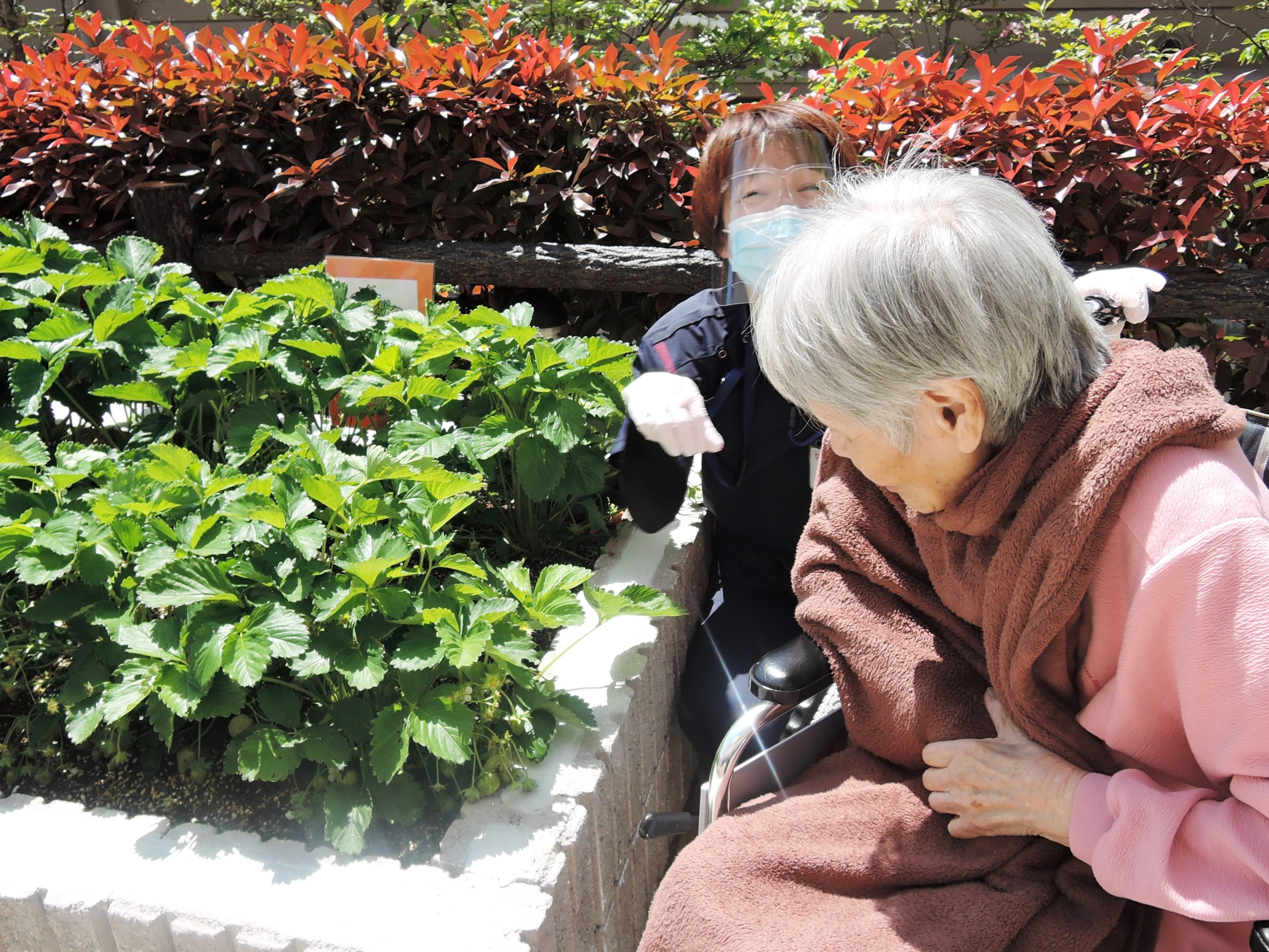 赤く色づいたイチゴを患者さまとリハビリスタッフで一緒に探します。