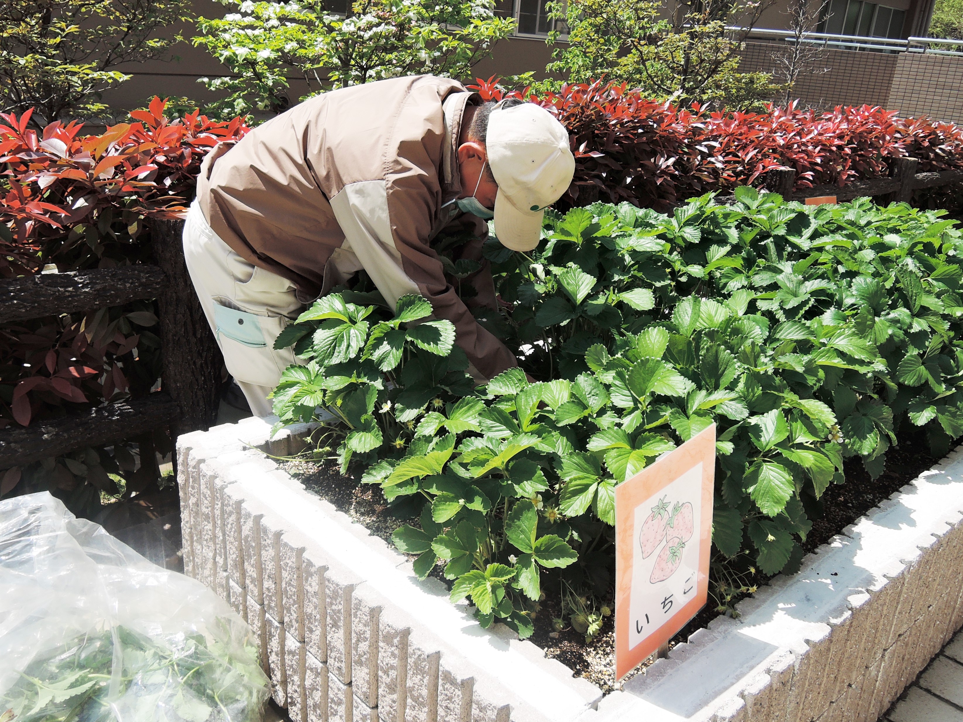 ハナミズキガーデン(こんごう棟中庭)ではイチゴを育てています。
