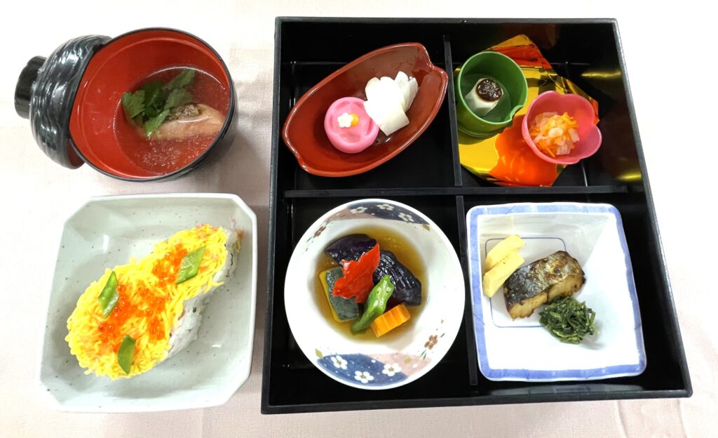 <献立>彩ちらし、鰆の柚庵巻き、多喜合わせ他 ※昼食でご提供いたします。