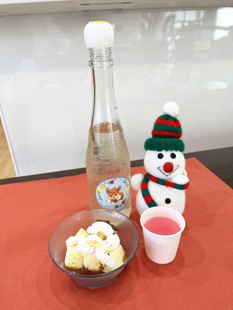 シャンメリーなどのお飲み物とロールケーキそしてたこ焼きをお召し上がりいただきました。