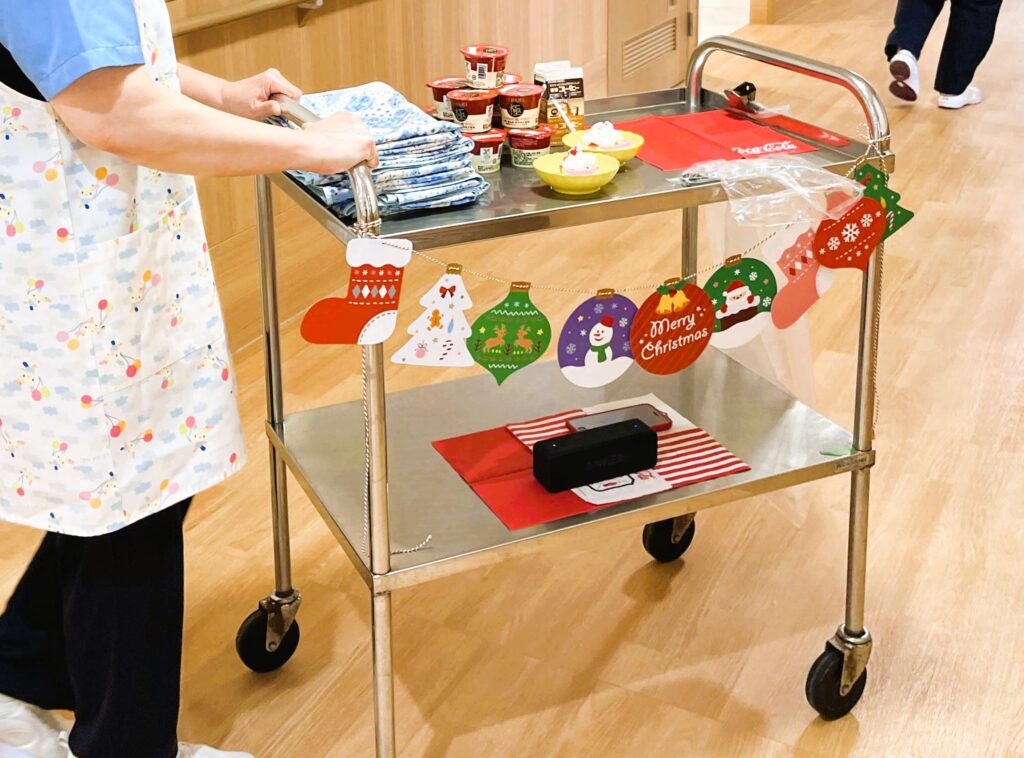 クリスマス会 ~かつらぎ4病棟~ 2023.12.24 イベント 患者さまに馴染みのある歌謡曲やクリスマスソングを一緒に合唱しました。 合唱の後には、挽きたてのコーヒーとケーキorプリンをご用意。 病室にいらっしゃる患者さまにはクリスマスソングを流しながら、ワゴンサービスを。 お食事の摂取ができない方には、スタッフサンタがフットケアをさせていただきました。 【関屋病院のクリスマス 2023】 →こんごう2病棟 →かつらぎ3病棟 →かつらぎ4病棟 →こんごう1病棟 →ふたかみ2病棟 →こんごう3病棟 →ふたかみ3病棟