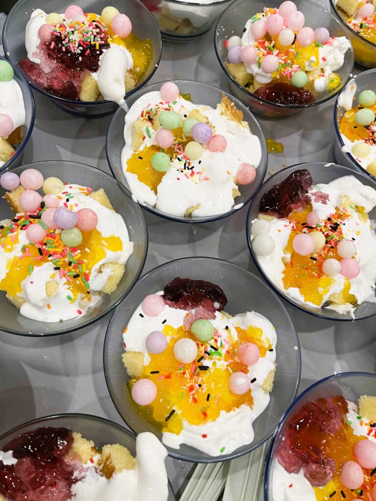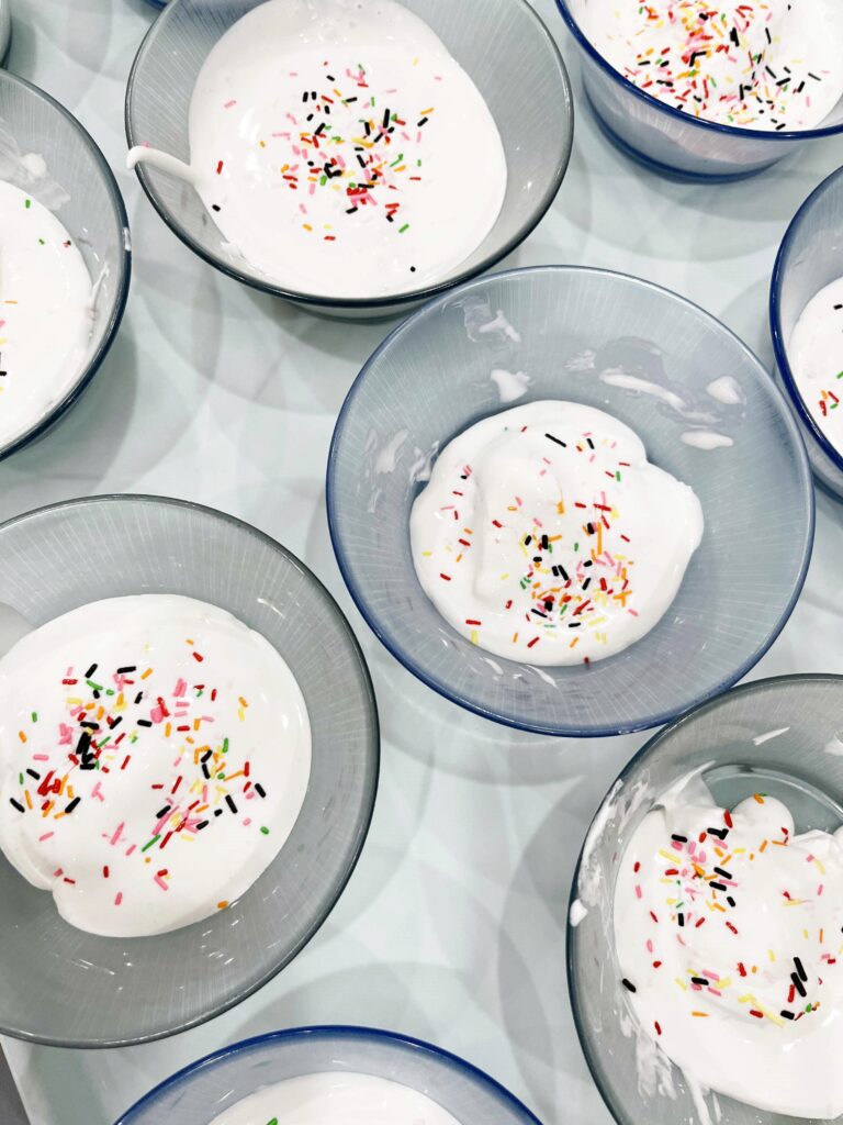 クリームの上に飾っているカラフルな玉は、香川県の「おいり」という米菓子です。