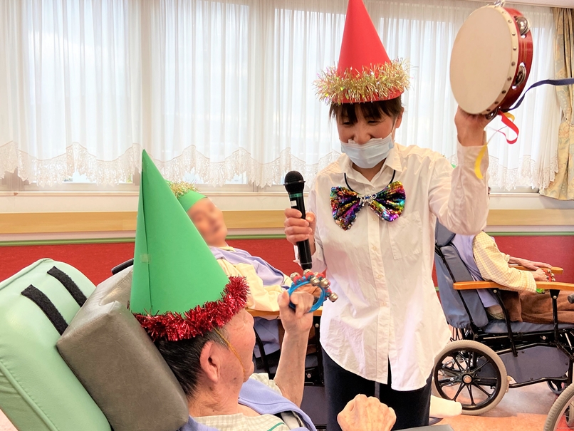 はじめにクリスマスソングに合わせて患者さまとスタッフで鈴やマラカスを鳴らして大合奏。