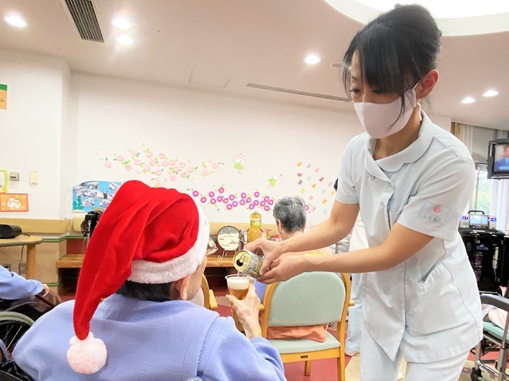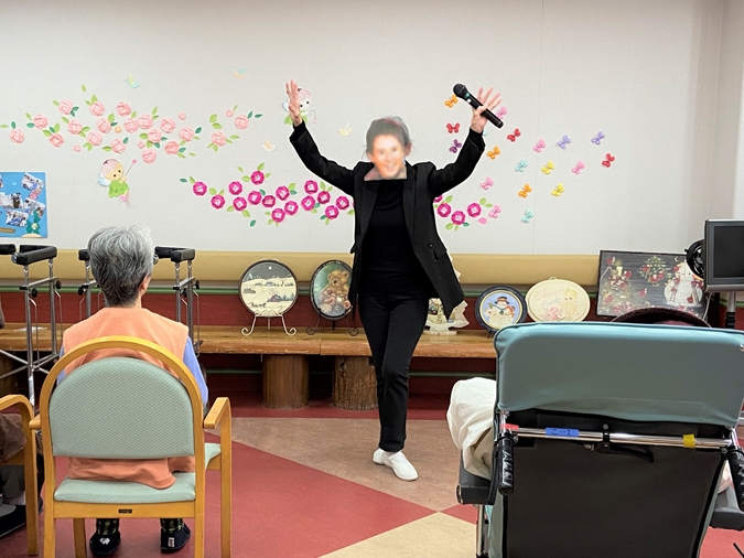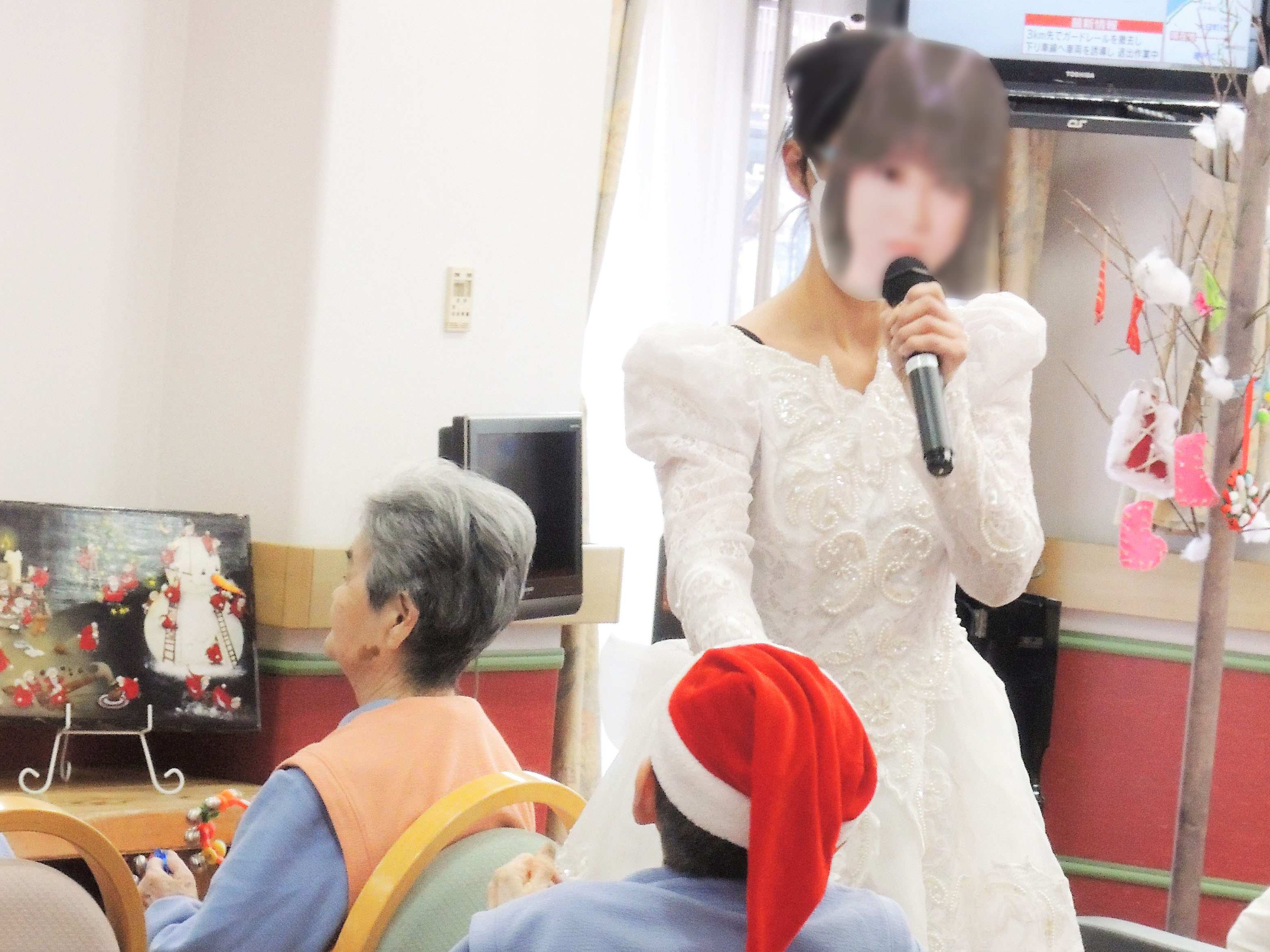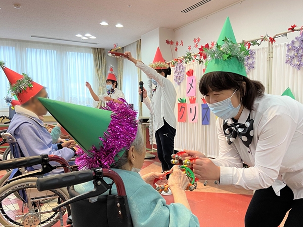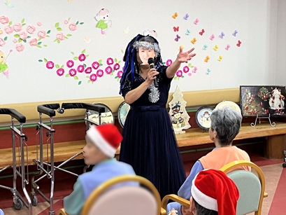 写真はありませんが、歌謡ショーには、演歌界最高の大物歌手と言われるスターをパフォーマンスするスタッフも。それを見た患者さまはクリスマス会の後も「スターが来てくれたね」と何日もスタッフにおっしゃって喜んでおられたそうです。
