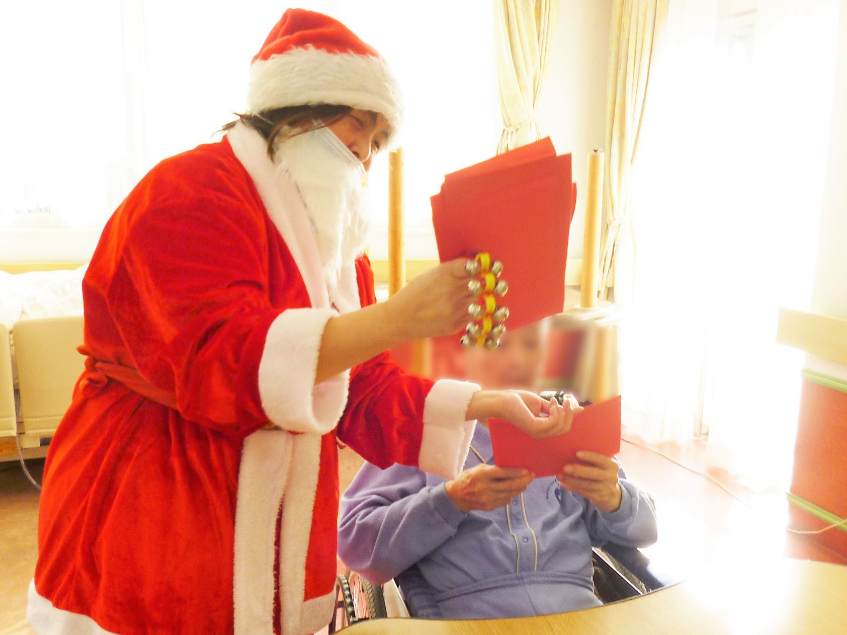 プレゼントはクリスマスカードでした。こちらのクリスマスカードにはクリスマスツリー飾りの前で撮影された患者さまの写真が入っています。 今日の日の記念に、お部屋に飾っていただけますように。