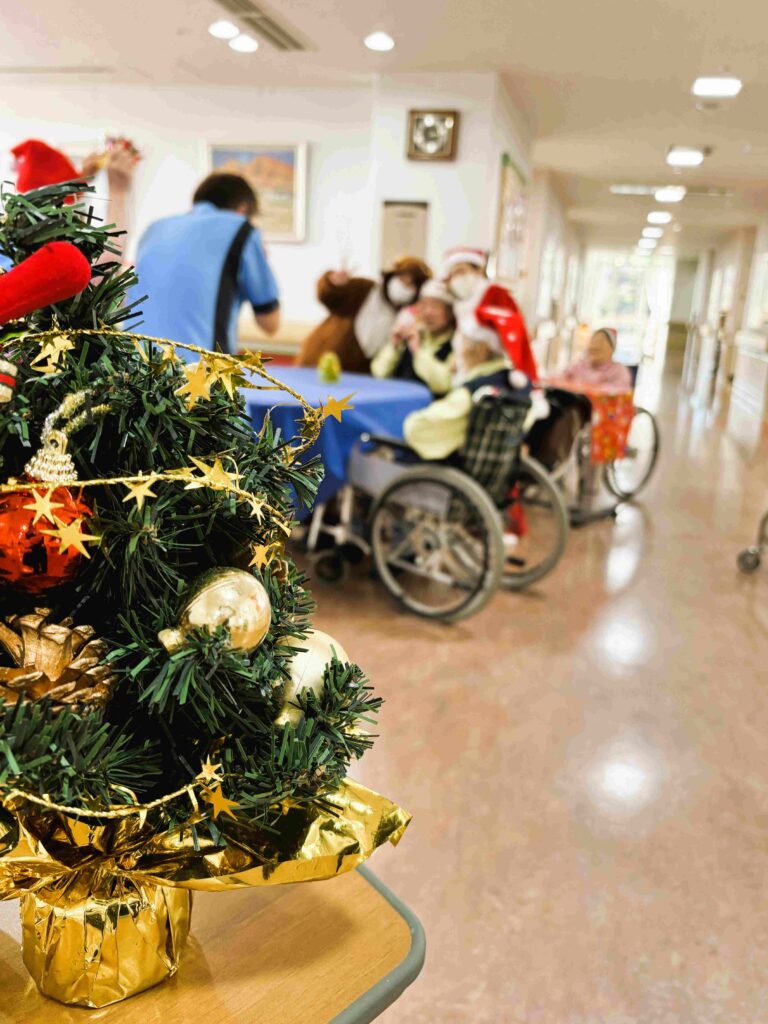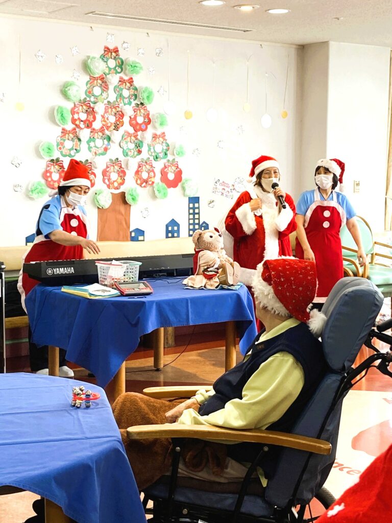 こんごう3病棟のクリスマス会は、毎年恒例の「師長サンタ」の登場で幕開け。