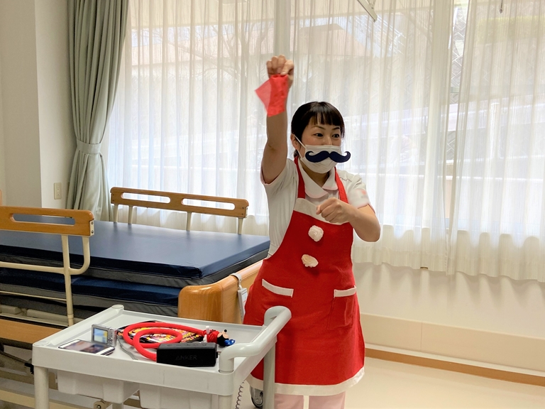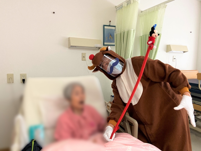 サンタに扮したスタッフは患者さまのお側で一緒に歌いたいとマスク代わりのサンタのヒゲに加えフェイスシールドを着用。 サンタの雰囲気を出すために白髪のカツラも手づくりしました。