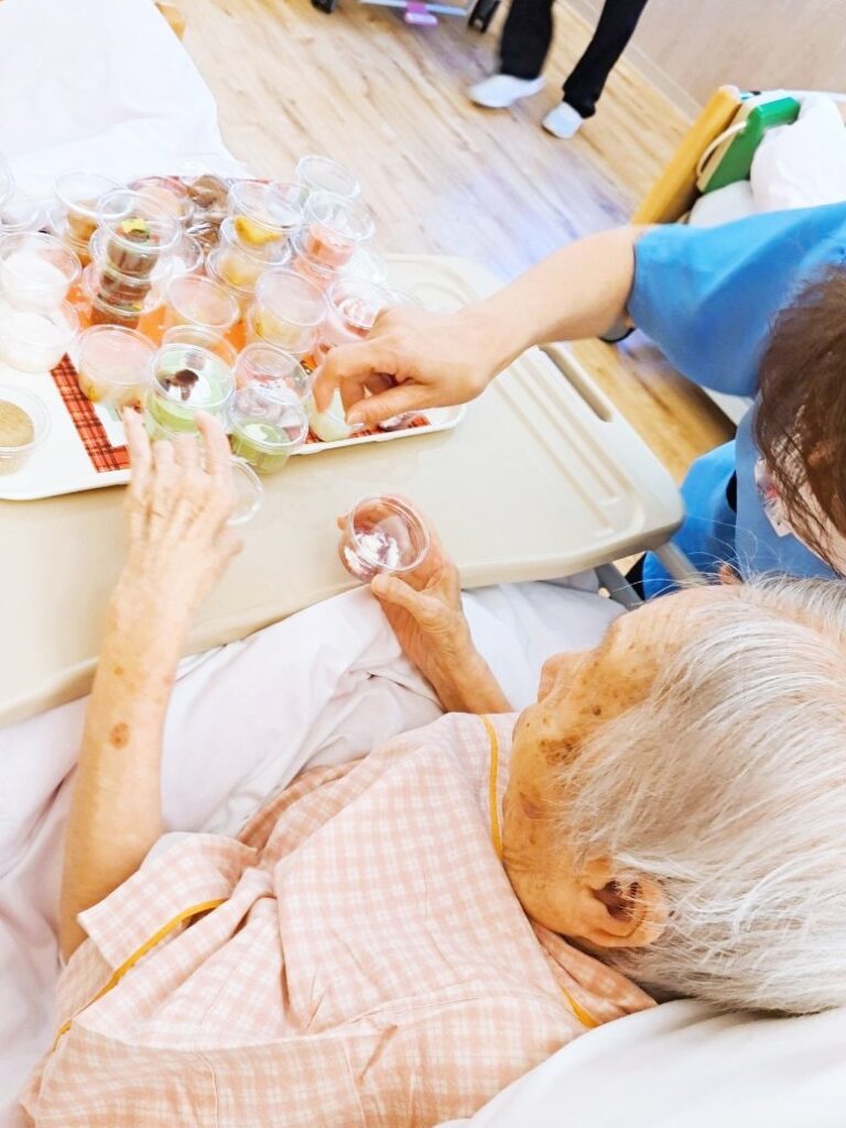 噛む力が弱い方にもお楽しみいただけるクリームやムースをはじめ、しっかりとした形のあるどら焼きやケーキなど、患者さまの状態やお好みに合わせてお好きなスイーツをお選びいただけるよう、たくさんの素類のケーキをご用意しました。