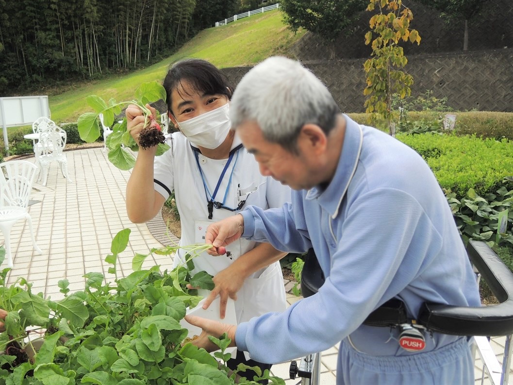 また、院内菜園の野菜を食事でご提供した時には「採れたてはおいしいね」とお声がけいただくことも。患者さまと一緒に野菜を収穫することもある菜園は、いま実りの秋を迎えています。