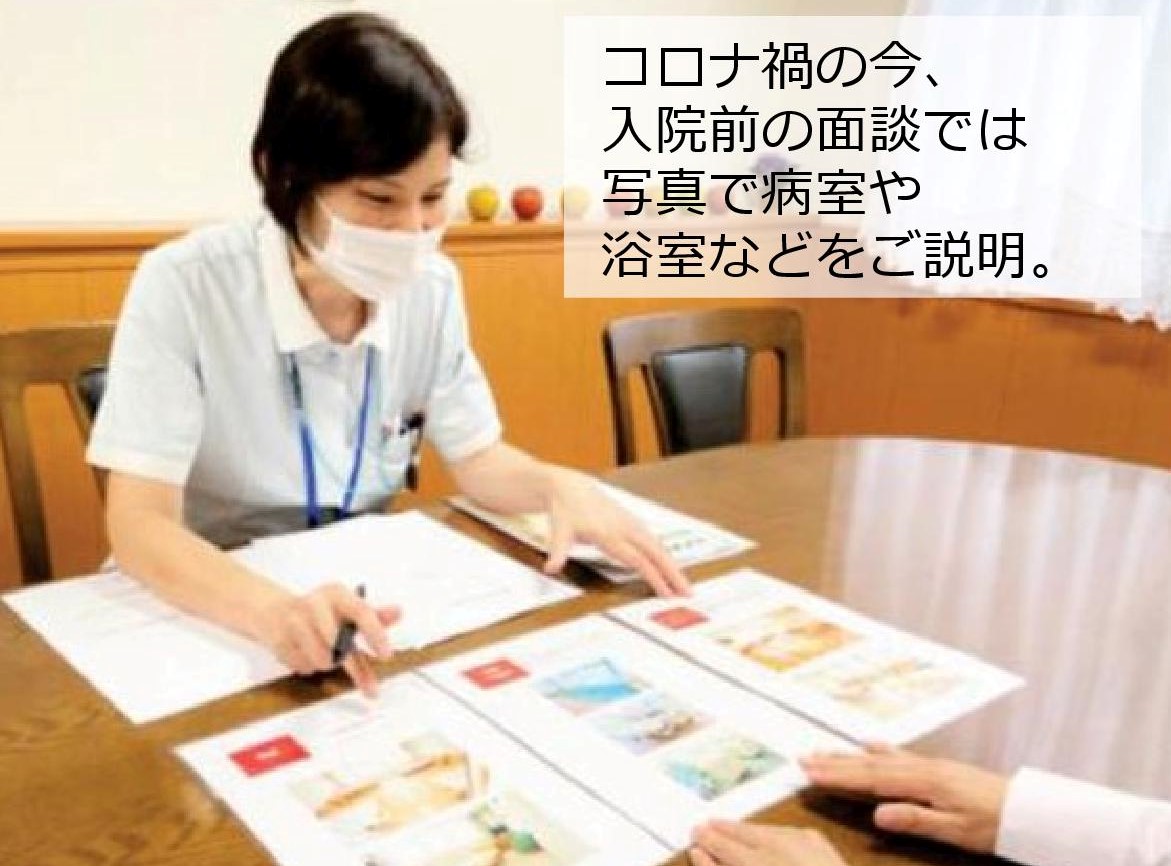 今まではお越しいただいた際に、病棟や庭園など院内各所をご案内しておりましたが、コロナ感染症対策のため実際に院内を巡りながらご案内することが難しくなったので、現在は写真をご覧いただきながら相談室内でご案内いたしております。