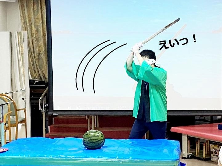 こちらのスイカ割りの様子は、7月17日(土)、各病棟に映像でご覧いただきます。