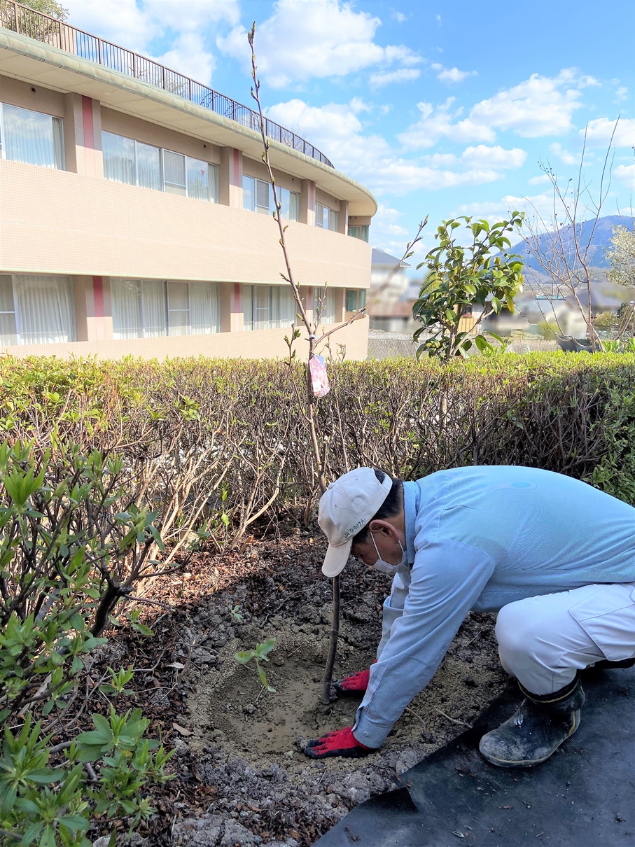 ソメイヨシノを4本植樹しました。 2022.04.16 お知らせ 暖かな日差しが降りそそぎ気持ちも晴れやかな春、こんごう棟から見える桜が満開を迎えました。 先日、ふたかみ棟からもお花見をしていただけるようにと桜の苗木を植樹しました。 ソメイヨシノの苗木を購入↓ 桜がしっかり根付くよう気持ちを込めて穴掘りをし、 4本植樹しました。 淡いピンクの色で柔らかい花びらが特徴のソメイヨシノ。 来年どれだけ花を咲かせてくれるのか楽しみです。