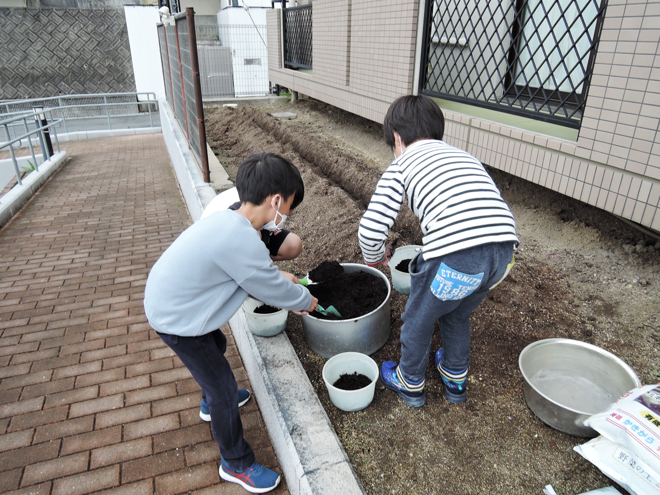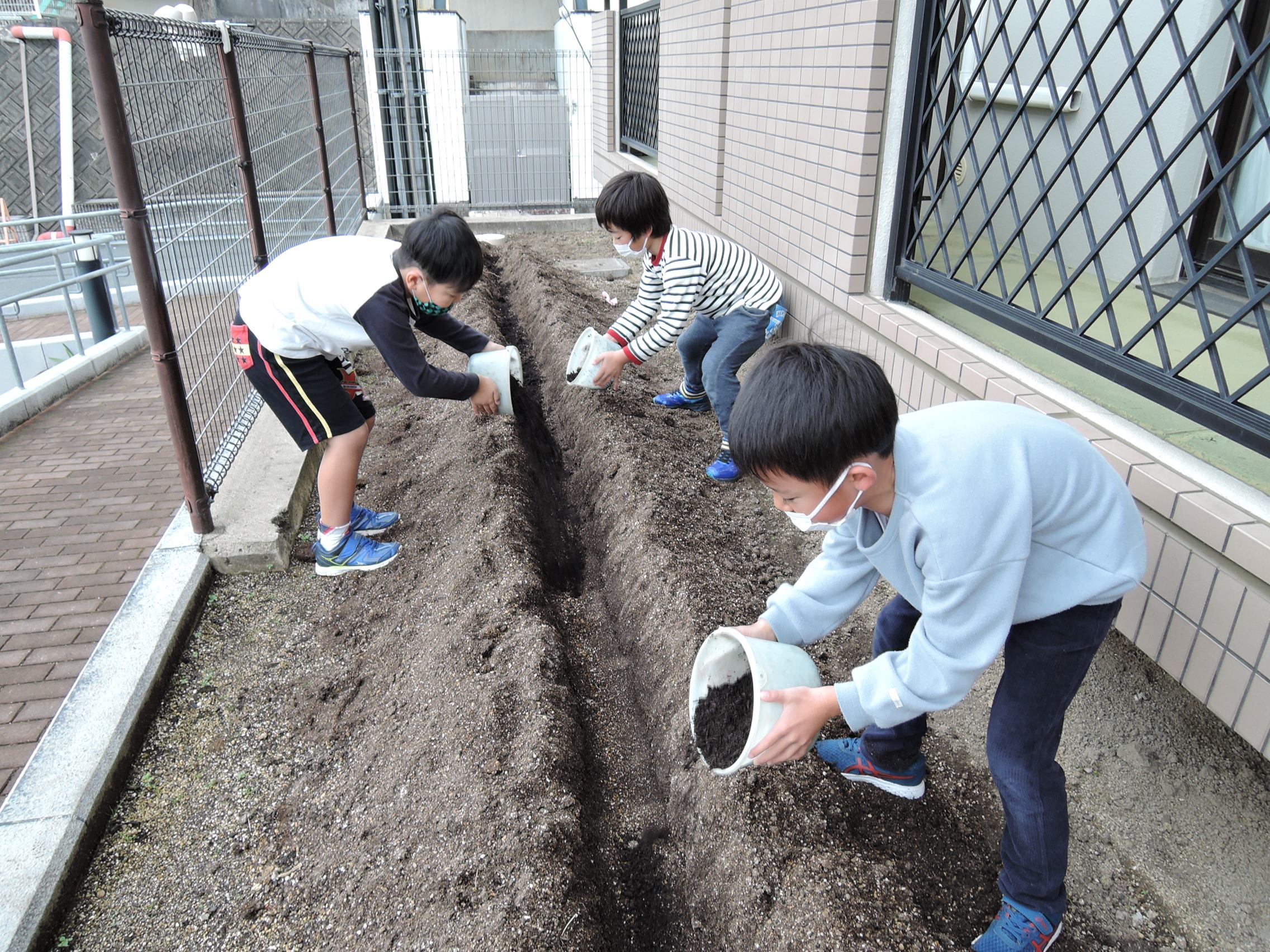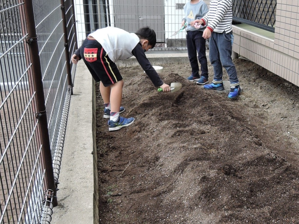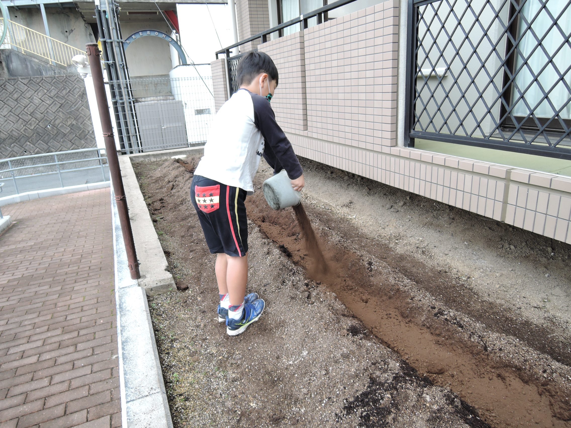 タマネギの苗を植えました① ~みどり保育所~ 2020.11.16 お知らせ 植えをする、その前に… 今年は小学生と5歳児の男の子達が畝作りに挑戦しました。 まずは、たい肥を土に撒いていきます。 次は、鶏糞。。。 「触るの嫌だよ~…」と言っていた鶏糞も、 ご覧のとおり。 もう、慣れたものです。 形を整えたら、畝の出来上がり。 男の子達、お疲れ様でした♪