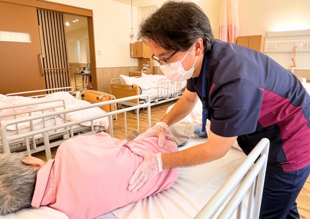 同じ姿勢が続くと関節が硬くなるため、声をかけながら体をマッサージし、痛みがないように関節をゆっくり動かします。
