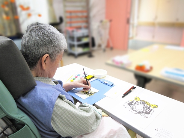 片手動作練習の一環として、作品作りを行っている患者さまがおられます。非利き手だった左手で行う作業は、容易ではないと思うのですが、いつも根気強く取り組んでくださっています。昨年末、ご家族さま宛てに年賀状を出すことを提案すると、大きくうなずいてくださり、作成することになりました。トラを描くことを決めて、真っ白な年賀はがきに、職人の表情で取り組まれていました。思いを込めて作られた年賀状を見て、私も2022年の年賀状は手書きしてみようと思いました。
