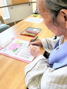 リハビリに対して普段は消極的な方でも、ご家族さまとの面会後によい反応を示されることがあります。面会の翌日はいつもより表情が明るくなっていたり、運動だけでなく創作活動にも参加されたり、というのもその一例です。写真の患者さまは動きづらい利き手を
