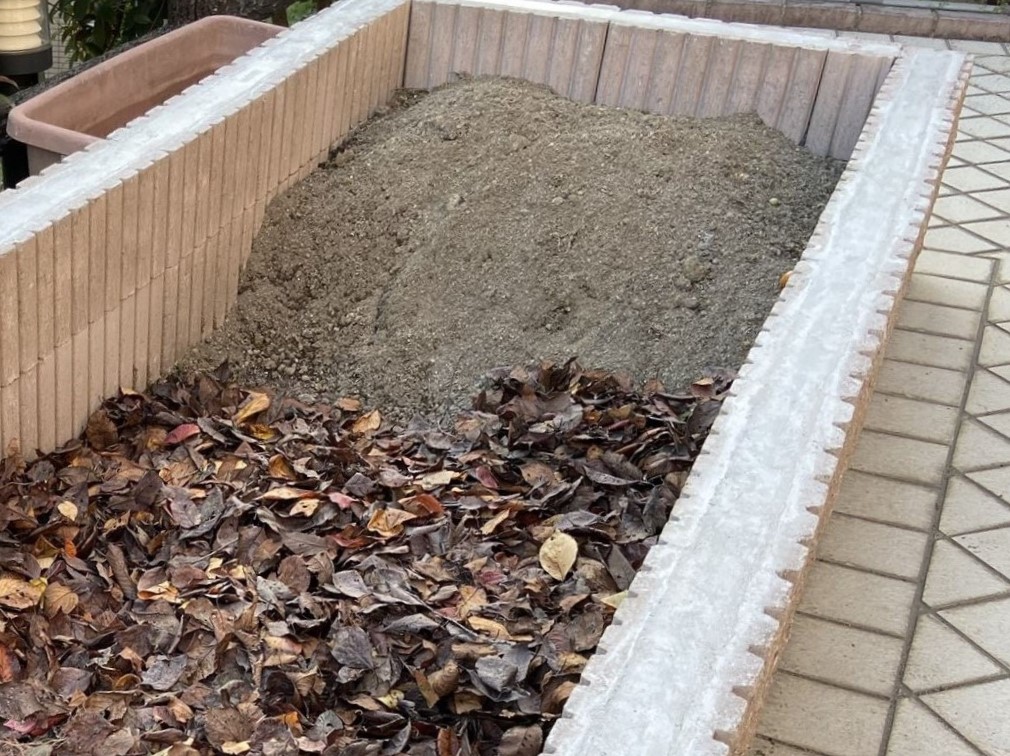 ブロックを摘んだ囲いの後は、畑で大切な土(堆肥)づくりを。