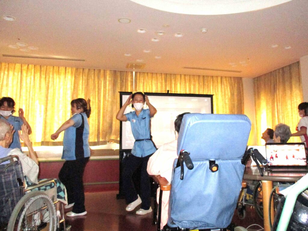 スタッフと患者さま全員で馴染みのある音楽で体操を行いました。