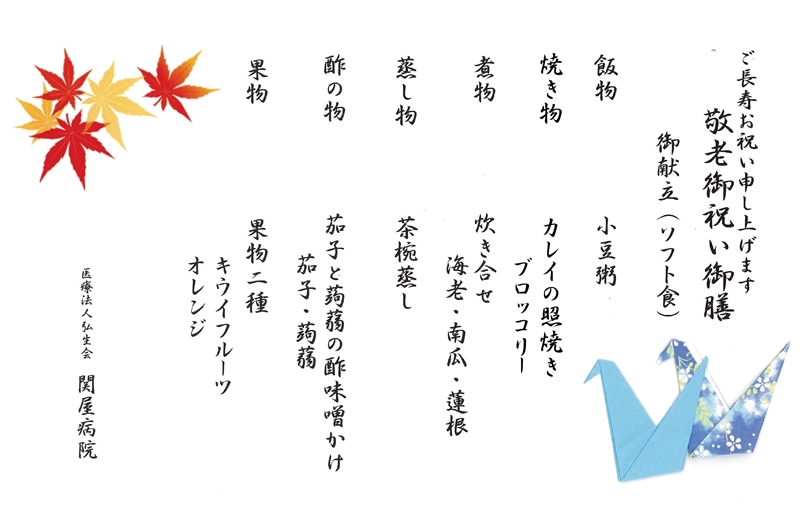 御献立の「折り鶴」は心ばかりですがスタッフ全員のお祝いの気持ちです。