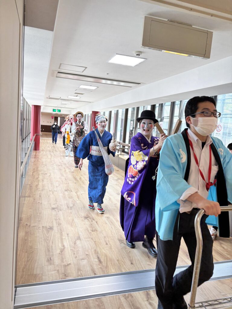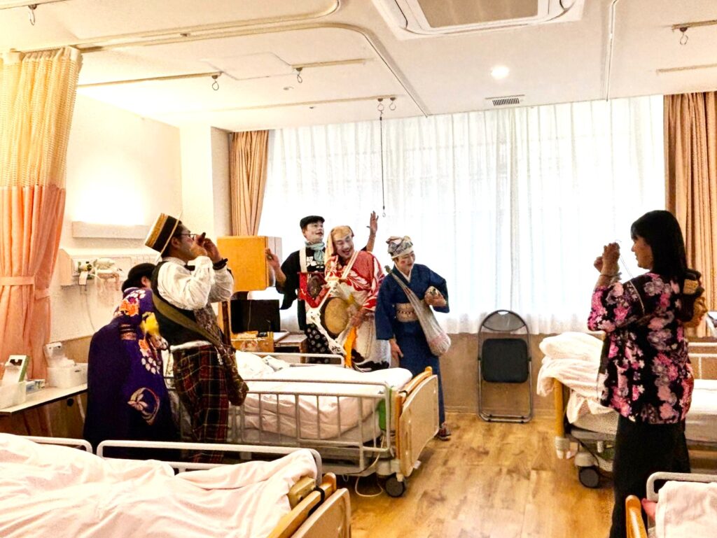 伝統衣装に身を包んだ一座が、各病棟を歩いて巡りながら演奏を披露。